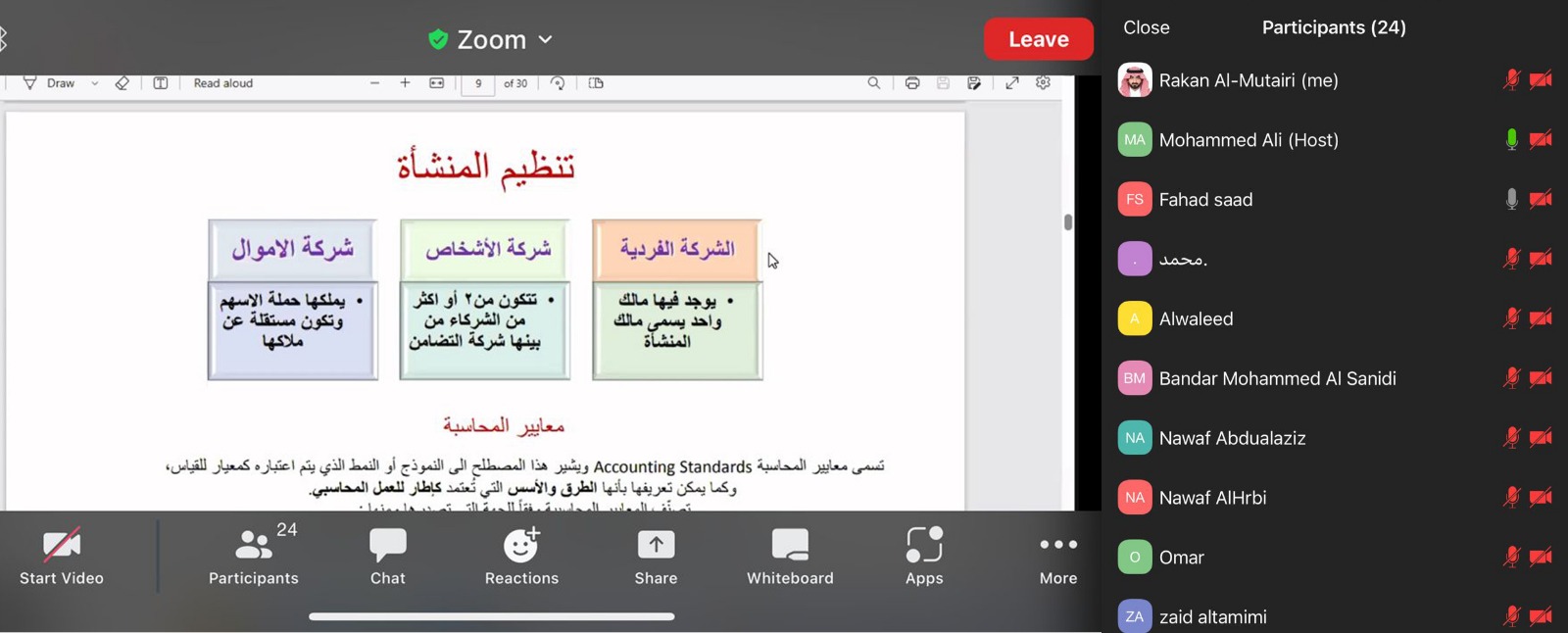 أقامت كلية إدارة الأعمال في حوطة بني تميم ممثلة بقسم المحاسبة برنامجًا تدريبيًّا عن بُعد، تحت عنوان: (أساسيات المحاسبة المالية)، قدمه أ. محمد بن علي الغامدي المعيد في القسم، يوم الاثنين ١٤٤٤/١٠/٢٤هـ.