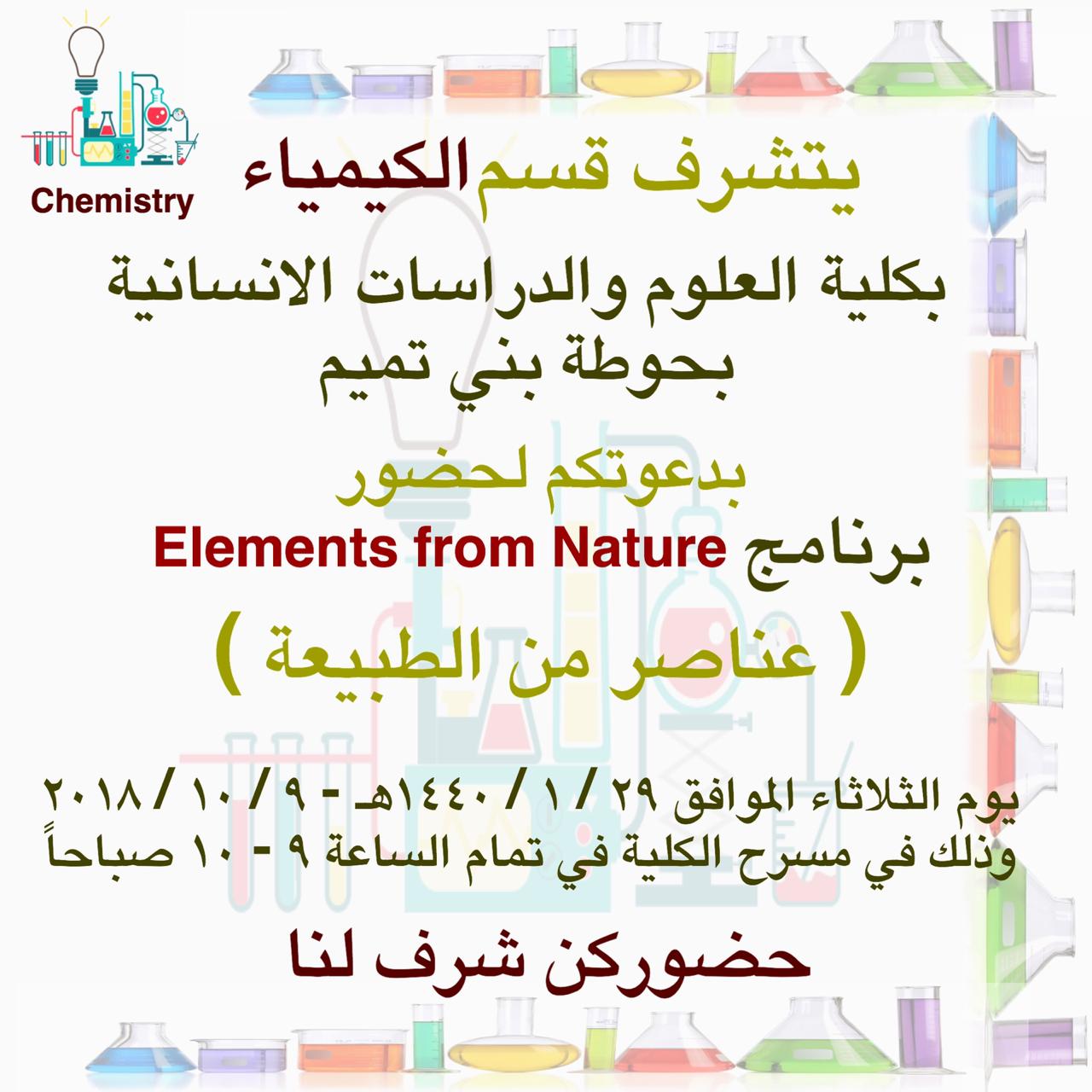 لقد خلق الله سبحانه وتعالى هذا الكون بأكمله، وجعل سبحانه بين كل هذه المخلوقات من جمادات أو أحياء تناغماً موزوناً لا يختل أبداً إلا بمشيئته. تجلى ذلك الإبداع بتوضيح متميز لطالبات قسم الكيمياء بكلية العلوم والدراسات الإنسانية بحوطة بن تميم صبيحة يوم الثلاثاء الموافق ٢٩ / ١ / ١٤٤٠هـ ، حيث نفذن برنامج (عناصر من الطبيعة) في مسرح الكلية عند الساعة العاشرة صباحاً. تحدث البرنامج عن عناصر من الطبيعة في الجدول الدوري للعناصر وأماكن تواجدها في أي دورة و أي مجموعة ورموزها وأشكالها بالطبيعة وأهمية تواجدها بالحياة وماهية هذه العناصر مثل البوتاسيوم والفضة وغيرها. اختتمت البرنامج وكيلة الكلية الدكتورة مي مصطفى بشكر الطالبات على ما أعدوه وقدموه من معلومات ثرية وبشكر مشرفة النشاط الطلابي بالقسم الاستاذة لمياء آل سالم.