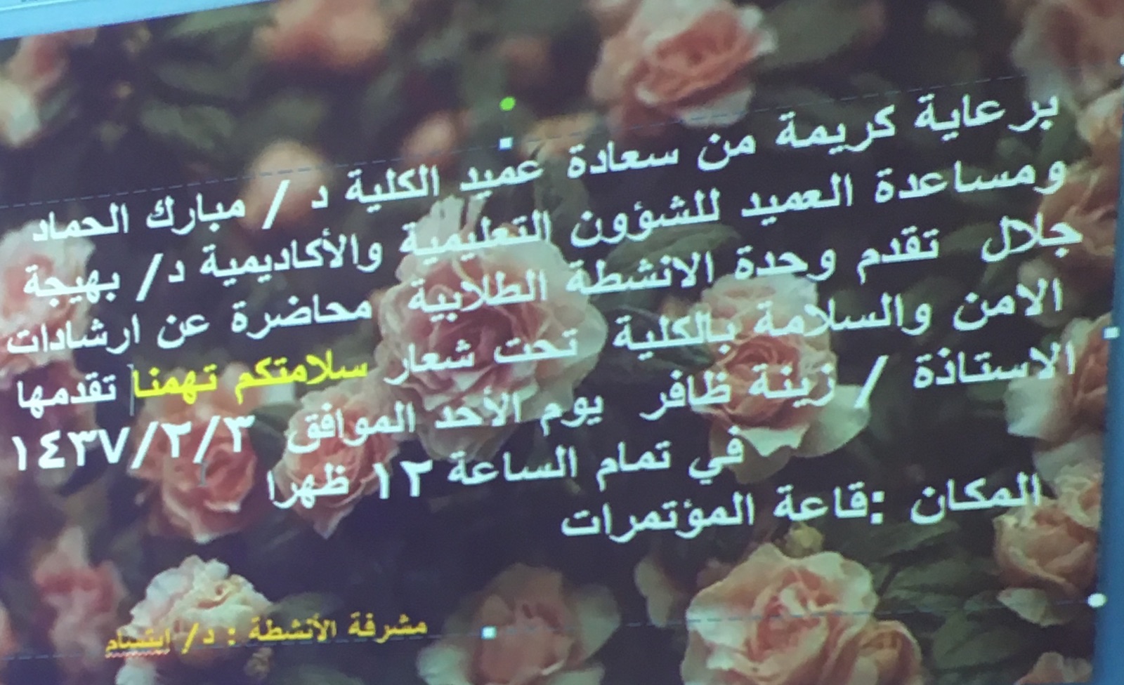 أقامت وحدة الأنشطة بكلية العلوم الطبية التطبيقية يوم الأحد الموافق 1437/1/3هـ برنامج ثقافي عن إرشادات السلامة تحت شعار (سلامتكم تهمنا ) بإشراف الأستاذة زينة ظافر، وأحتوى البرنامج على فقرات عديدة منها ,مفهوم السلامة وأهدافها، والإرشادات الواجب أتباعها في المعامل و تم عرض بوربوينت عن العلامات والرموز داخل المختبرات ، وأنواع نغمات أجهزة الإنذار ،والتصرف السليم عند سماعها ، وتبيينَ لمخارج الطوارئ ونقطة التجمع ، تم التعرف على طريقة الاستخدام السليم لطفاية الحريق ، وكان ذلك بحضور مساعدة العميد للشؤون التعليمية والأكاديمية وعدد من أعضاء هيئة التدريس والموظفات وطالبات الجامعة .