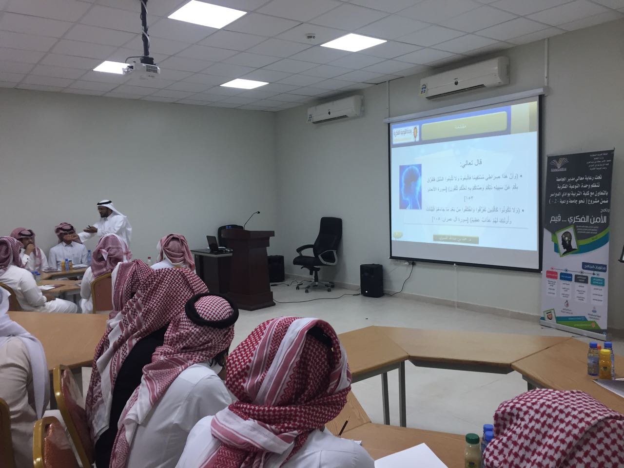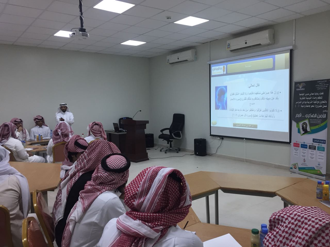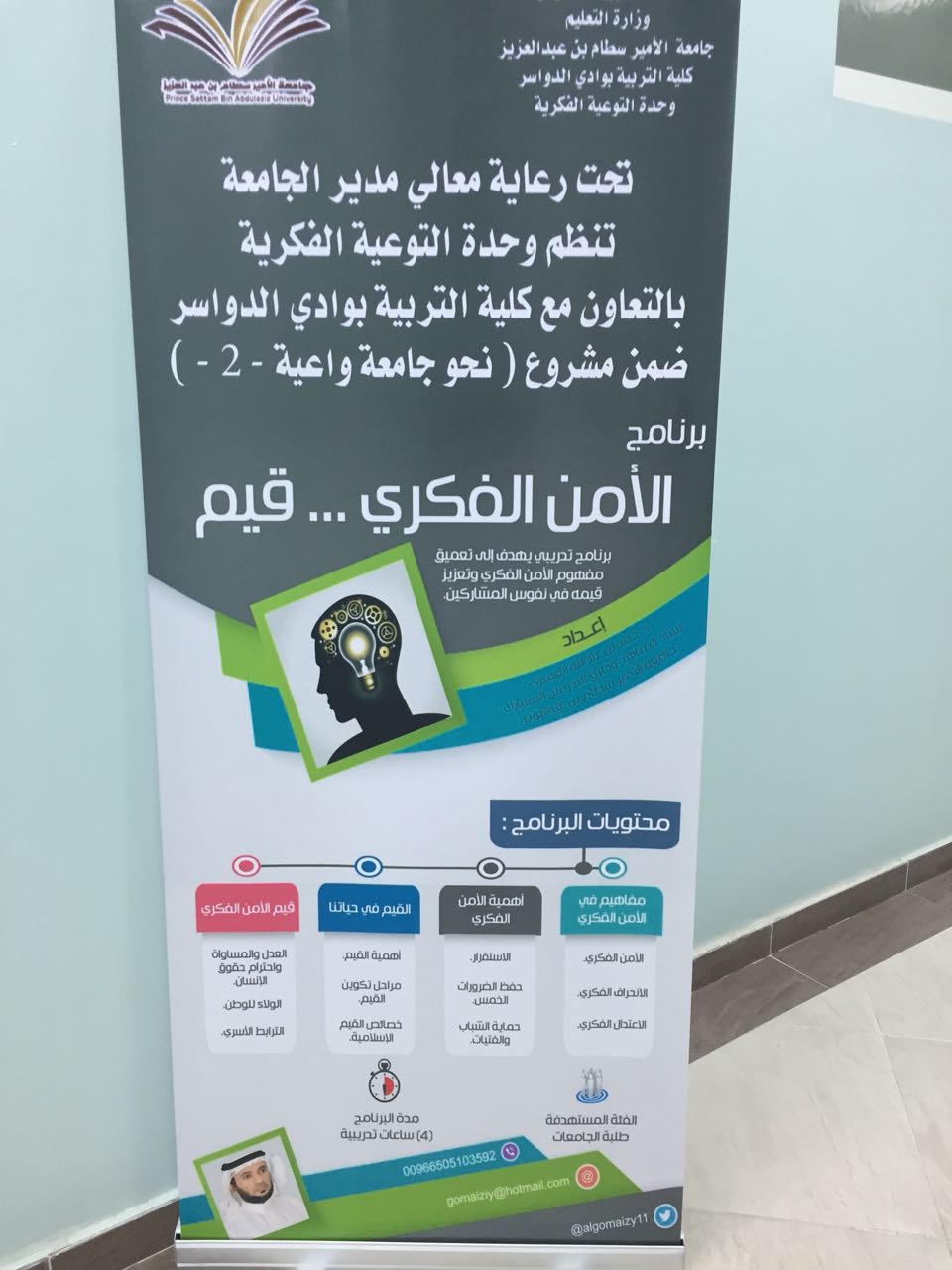 تحت رعاية معالي مدير الجامعة الدكتور عبدالعزيز بن عبدالله الحامد وبالتعاون مع كلية التربية بوادي الدواسر نظمت وحدة التوعية الفكرية بالجامعة برنامج تدريبي بعنوان "الأمن الفكري قيم" ضمن مشروع نحو جامعة واعية 2 ، وذلك بقاعة التدريب بكلية التربية.