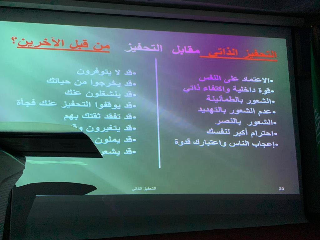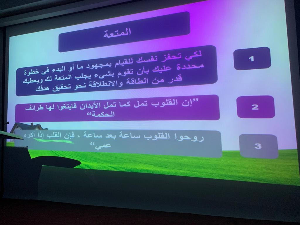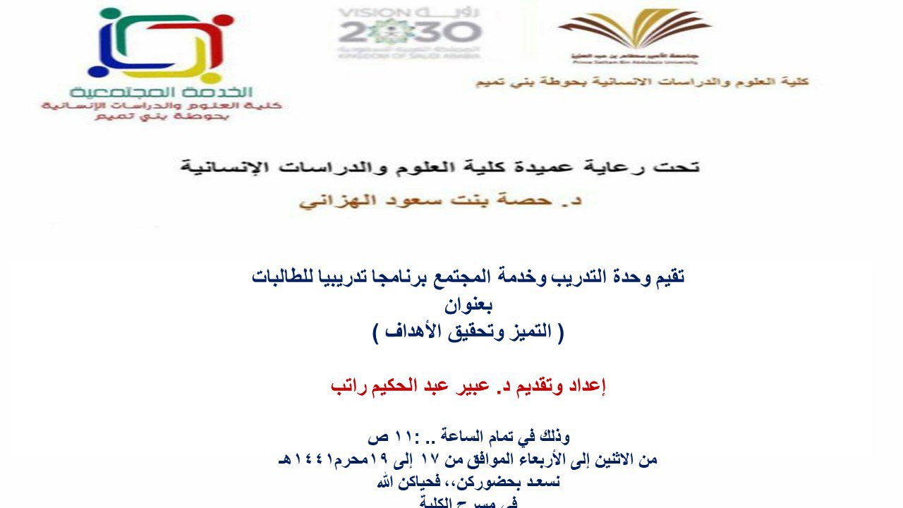 unicode-bidi:embed">أقامت كلية العلوم والدراسات الإنسانية بحوطة بني تميم تحت قيادة عميدة الكلية د. حصة بنت سعود الهزاني، وبإشراف وحدة التدريب والخدمة المجتمعية، برنامج تدريبي للطالبات على مدار ثلاثة أيام متواصلة بعنوان "التميز وتحقيق الأهداف " تقديم د. عبير عبد الحكيم, ويندرج تحت هذا العنوان ثلاثة محاور وهي: التحفيز الذاتي - الإدارة الفعالة للوقت - التخطيط لتحقيق الأهداف، بهدف تحفيز الطالبات لاكتساب عادات الناجحين، وابتداء من يوم الأثنين الموافق ١٤٤١/١/١٧ هـ في تمام الساعة الحادية عشرة صباحاً وانتهاء بيوم الأربعاء ١٤٤١/١/١٩ هـ في مسرح الكلية ، وقُدّم لكل يوم تدريبي حقيبة تدريبية للمشاركات و عرض تقديمي يتضمن أنشطة وفيديوهات وقصص ، لتشجيع الطالبات للتخطيط والإدارة الناجحة للوقت، قدم البرنامج هديته (مفكرة وقلم) وشهادة حضور للمشاركات . وقد شهد البرنامج التدريبي حضوراً و تفاعلاً من بعض طالبات أقسام: اللغة العربية، الكيمياء، اللغة الإنجليزية، الدراسات الإسلامية.