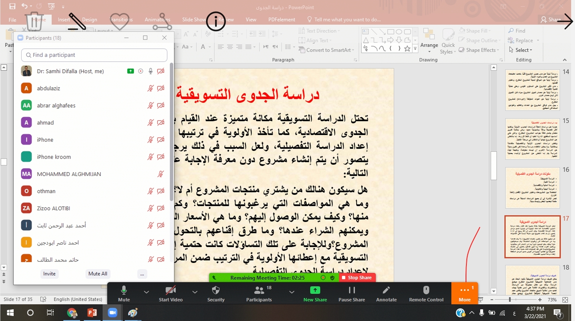 وقد تناول د. سمحي في حديثه مفهوم عملية تقييم المشروعات، مبيّنًا أهمية دراستها وتقييمها، ومشيرًا إلى مراحل تلك الدراسة، وأنواع دراسات الجدوى: دراسة الجدوى الأولية، ودراسة الجدوى التفصيلية، إضافة إلى مكونات دراسة الجدوى التفصيلية: الدراسة التسويقية، والدراسة الفنية، والدراسة المالية والاقتصادية، والدراسة البيئية والقانونية.