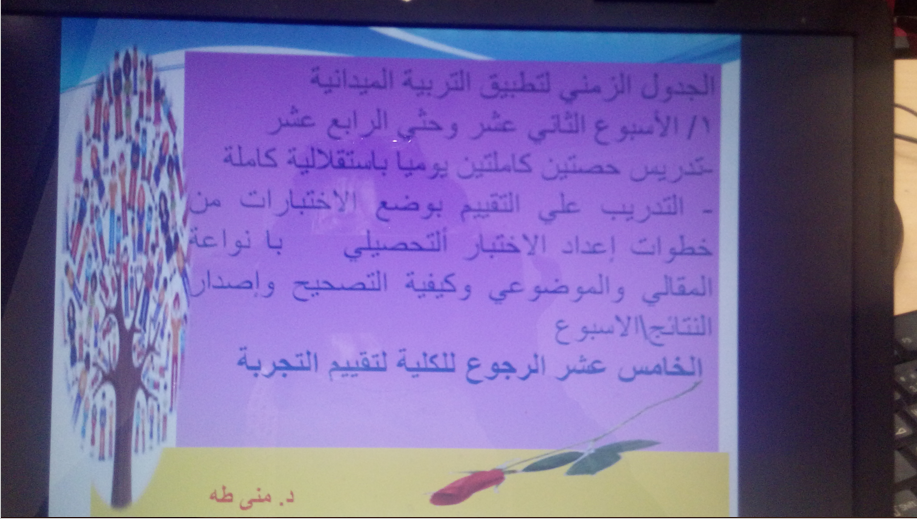 -1تعريف ومناقشة الطالبات بإجراءت تحضير وتنفيذ وتقويم الدرس بالإضافة إلى التعريف بأهمية السمات الشخصية للطالبة المعلمة.