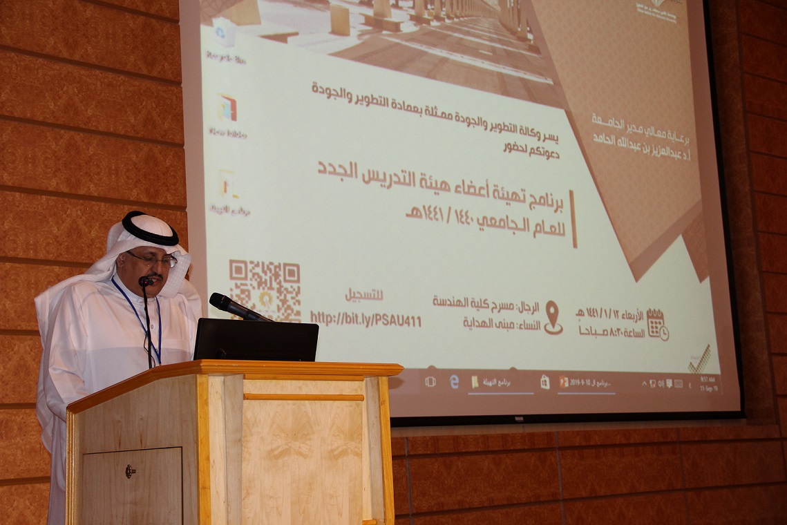 تحت رعاية معالي مدير الجامعة الأستاذ الدكتور عبد العزيز بن عبد الله الحامد نظمت وكالة الجامعة للتطوير والجودة ممثلة في عمادة التطوير والجودة برنامج تهيئة أعضاء هيئة التدريس الجدد للعام الجامعي 1440/1441هـ يوم الأربعاء 12/1/1441هـ الموافق 11/9/2019م بمسرح كلية الهندسة للرجال وبمبنى هداية للنساء، قام بتقديم الحفل سعادة الدكتور حسن بن ناصر الذروي وكيل عمادة التطوير والجودة وقد استهل الحفل بتلاوة بعض الآيات من الذكر الحكيم. ثم تم عرض نبذة عن المملكة ومحافظة السيح والجامعة وكلياتها. وبعد ذلك قدم سعادة وكيل الجامعة للتطوير والجودة الدكتور ناصر القحطاني كلمة يوضح من خلالها أهداف البرنامج وأهميته ونبذة عن الهيكل التنظيمي للجامعة. ثم توج البرنامج بكلمة من معالي مدير الجامعة الأستاذ الدكتور عبد العزيز الحامد يرحب فيها بالأعضاء الجدد ويحثهم على بذل الجهود لتحقيق اعلى المستويات التعليمية والبحثية. بعد ذلك ألقى الدكتور فهد السهلي عميد التطوير والجودة كلمة عن جودة البرامج والاعتماد الأكاديمي.