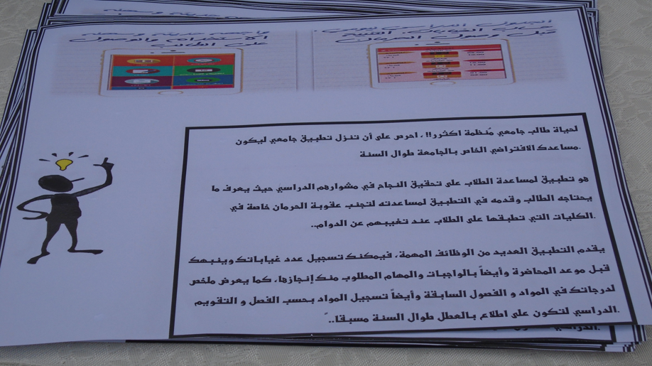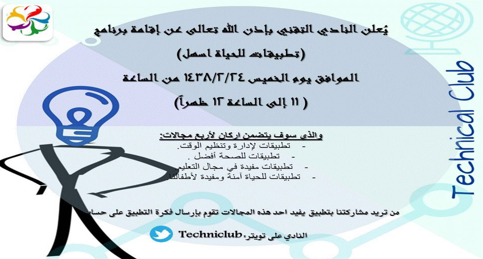 نظم النادي التقني بالتعاون مع وحدة العمل الطلابي أركان توعوية " تطبيقات لحياة أسهل " تحت إشراف مشرفة النادي أ.شهد التميمي ، يوم الخميس الموافق 25/2/1438هـ من الساعة 11صباحاً إلى الساعة 12 ظهراً في الساحة الخارجية بالكلية .