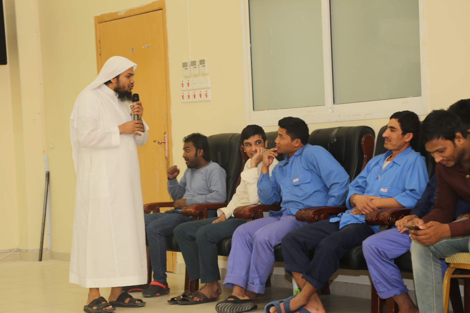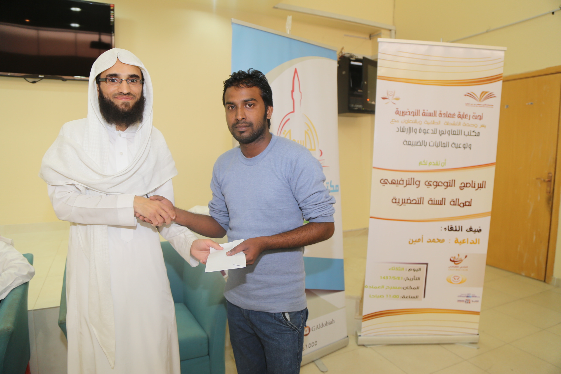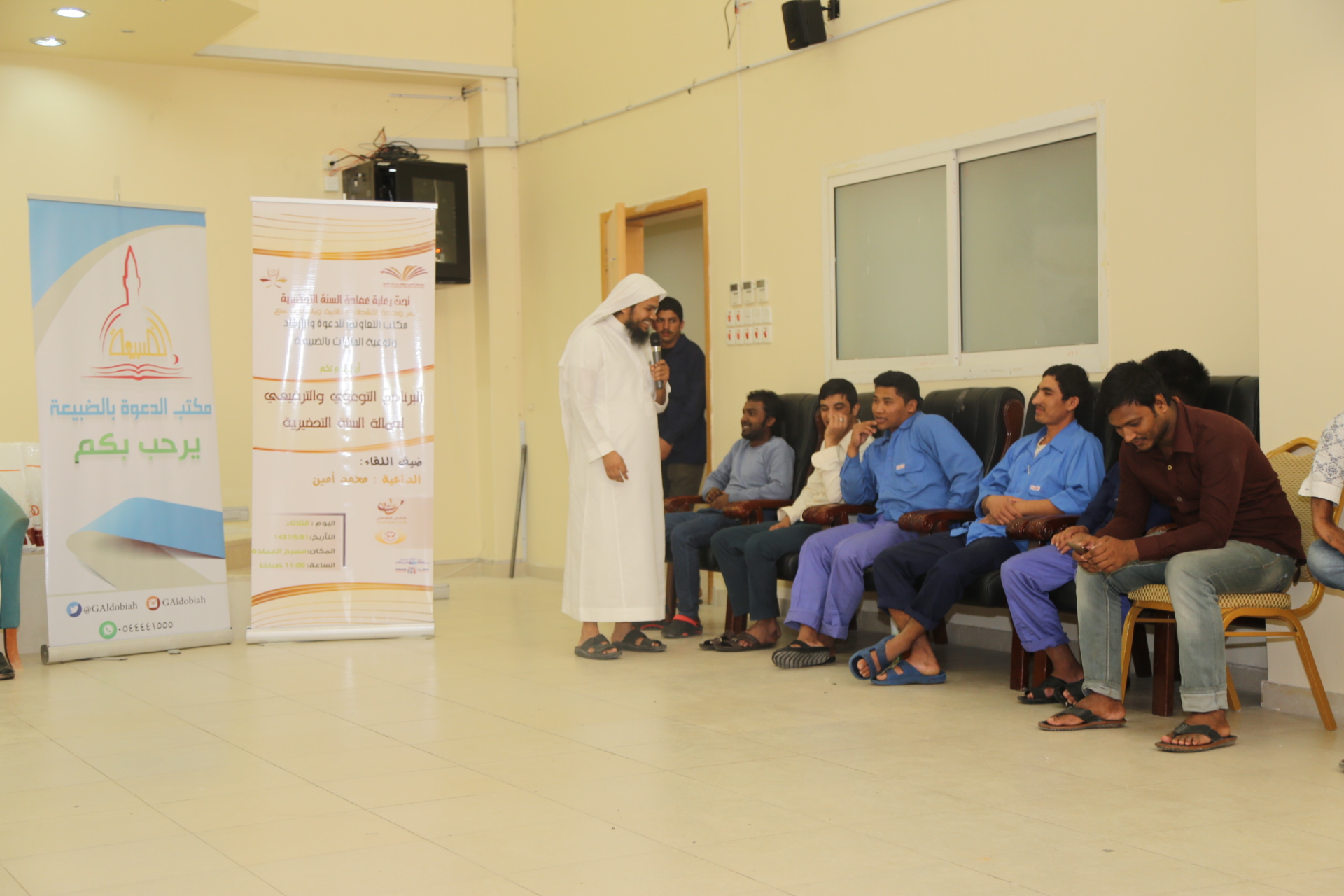 نظمت عمادة السنة التحضيرية ممثلة في وحدة الأنشطة الطلابية وبالتعاون مع المكتب التعاوني للدعوة والإرشاد وتوعية الجاليات بالضبيعة برنامجا توعويا وترفيهيا للعمالة التي تقوم بخدمات مبنى العمادة، وبحضور الأستاذ محمد شايع المطرفي مدير المشروع والأستاذ محمود الشاعر وفريق عمل الأنشطة الطلابية، حيث كان ضيف اللقاء الداعية محمد أمين الذي وجه كلمة توجيهية للمسلمين منهم وخص غير المسلمين ببعض المواضيع التي تعرف بالإسلام وترغبهم فيه، وفتح المجال بعد ذلك لأحد المسلمين الجدد حيث سرد قصة إسلامه، وتجاربه ومواجهة التحديات، وبين الشعور الجميل الذي يشعربه، ووجه نصيحة لمن لم يسلم بعد.