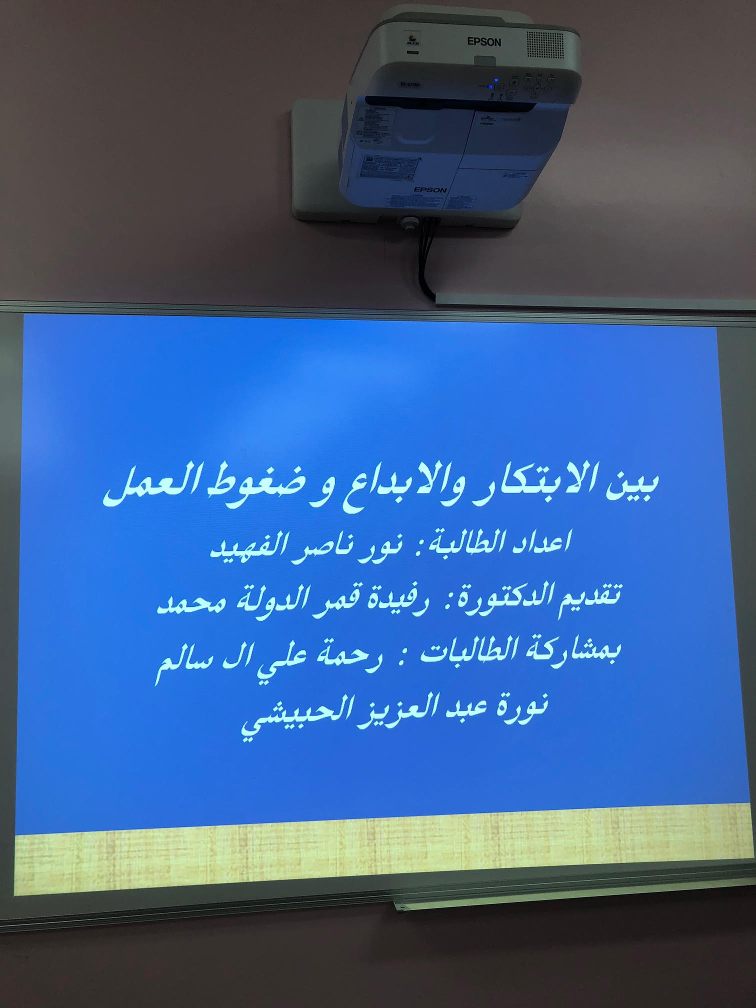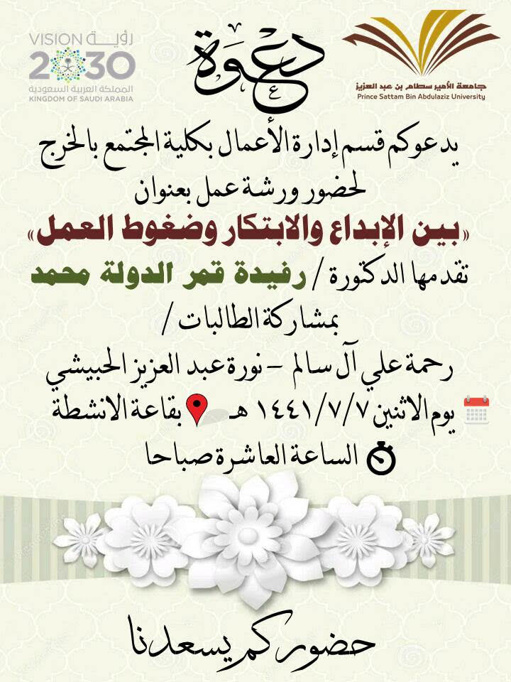 برعاية سعادة وكيلة كلية المجتمع بالخرج الدكتورة /أمينة عبد الرحمن المشحن ؛ وإشراف مديرة الإدارة بالكلية الأستاذة / نورة دحيم الدوسري؛ قدم قسم إدارة الأعمال بالكلية ورشة عمل مقدمة لمنسوبات الكلية من الطاقم الإداري والموظفات وأعضاء هيئة التدريس بعنوان "بين الابتكار والابداع وضغوط العمل يوم الاثنين الموافق 7-7-1441هـ في قاعة الأنشطة في الكلية ؛ "قدمتها الدكتورة /رفيدة قمر الدولة محمد ؛ بمشاركة الطالبات/ رحمة علي آل سالم ونورة عبد العزيز الحبيشي ؛ و استهلت الدكتورة الورشة بالتعريف بالابتكار والإبداع وأهم الفروقات بينهم وكيف أن ضغوط العمل تؤثر على الموظف وآدائه والابداع والابتكار فيه. كذلك تناولت الدكتورة التعريف بضغط العمل وأهم مسببات وأنواع ضغوطات العمل الداخلية والخارجية وتأثيراتها الايجابية و السلبية على الموظف وآدائه وعلى المنظمة ومدى تحقيق أهدافها. وقُدم خلال الورشة عدداً من الأنشطة والتدريبات موجهه لمنسوبات الكلية لأبداء آرائهن حول ضغوط العمل في الكلية ومدى الضغط الواقع على كل منهن وكيف يمكنهن اجتياز تلك الضغوط حيث لاقت الفقرة تجاوب كبير ومشاركة حماسية من قبل الحضور متناولين أهم الآثار الايجابية و السلبية لضغوط العمل.