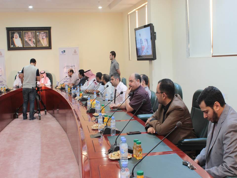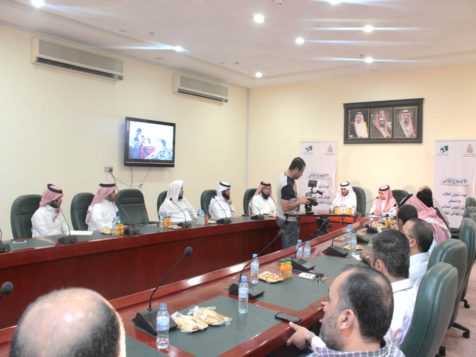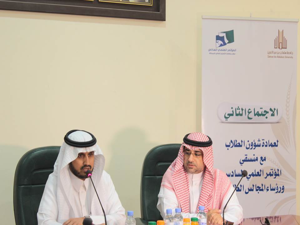 رأس وكيل الجامعة للشؤون التعليمية والأكاديمية والمشرف على أعمال المؤتمر العلمي السادس الدكتور عبدالرحمن بن إبراهيم الخضيري، الاجتماع الثاني للجنة العليا مع منسقي الكليات والمجالس الطلابية، في قاعة الاجتماعات بمبنى الهداية، يوم الخميس الموافق 13/1/1436هـ، وبحضور عميد شؤون الطلاب المنسق العام للمؤتمر الدكتور مسفر بن محماس الكبيري.