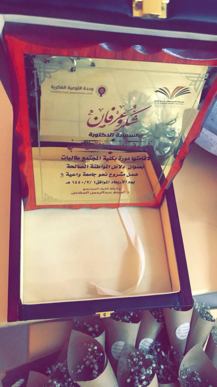 أقامت كلية المجتمع وبالتعاون مع وحدة التوعية الفكرية بالجامعة وضمن مشروع نحو جامعة واعية 3 يوم الأربعاء الموافق 1/2/1440هـ دورة تدريبية بعنوان" دلائل المواطنة الصالحة " قدمتها سعادة الدكتورة/ نوف ناصر التميمي. وبإشراف منسقة التوعية الفكرية في الكلية الأستاذة/ رفيدة قمر الدولة . وبحضور كوكبة رائعة من منسوبات الكلية وطالباتها وقد تناولت سعادة الدكتورة عدد من المحاور كان من أهمها مفاهيم الانتماء الوطني ومؤشراته ومعوقات الانتماء الوطني وسبل تعزيز الانتماء الوطني وتحدثت كذلك عن مضامين الأمن الوطني والفكري وسبل تعزيز الوطنية والدفاع عنها وقد صاحب الحديث عرض توضيحي وصور معبرة عن الوطنية والمواطنة الصالحة واختتمت حديثها بكلمات رائعة" من لم يكن يحمل هم الوطن فهو هم على الوطن " ثم أقيمت مسابقة بين طالبات الكلية عن الأمن الفكري والانتماء الوطني واختتم اللقاء بشكر وعرفان لسعادة الدكتورة من قبل كلية المجتمع ممثلة بوكيلة الكلية سعادة الدكتورة / أمينة بنت عبدالرحمن المشحن .