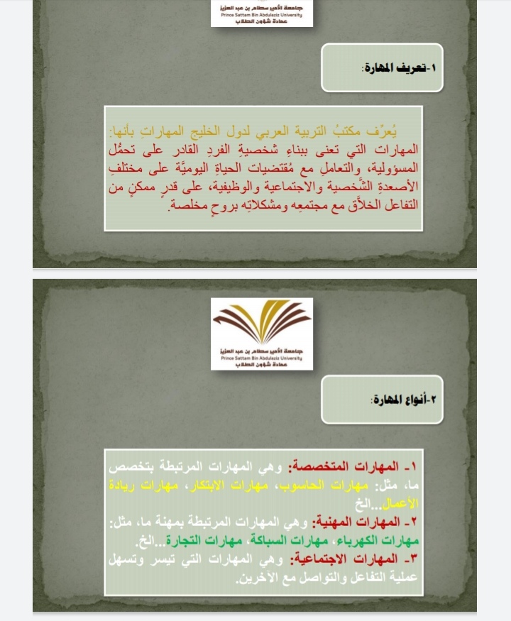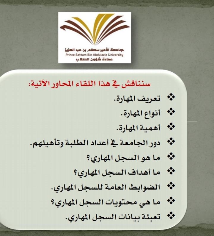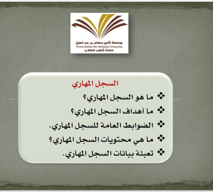 كما تناولت الدكتورة تعريفا مفصلا بالسجل المهاري من حيث التعريف والأهداف والأهمية والضوابط العامة التي تحكم السجل المهاري وكيفية تعبيئة بيانات هذا السجل.