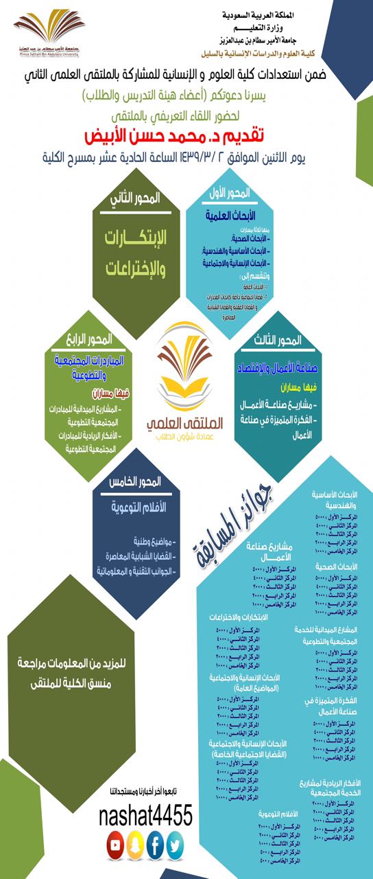 ضمن الحملة الإعلامية التعريفية المتعلقة بالملتقى العلمي الثاني والتي تقيمها عمادة شؤون الطلاب ، تنظم كلية العلوم والدراسات الإنسانية بالسليل لقاء عن الملتقى العلمي الثاني لأعضاء هيئة التدريس والطلاب ، يقدمه الدكتور محمد حسن الأبيض عضو اللجنة العليا للملتقى العلمي وذلك يوم الأثنين الموافق 1439/3/2هـ بمسرح الكلية.