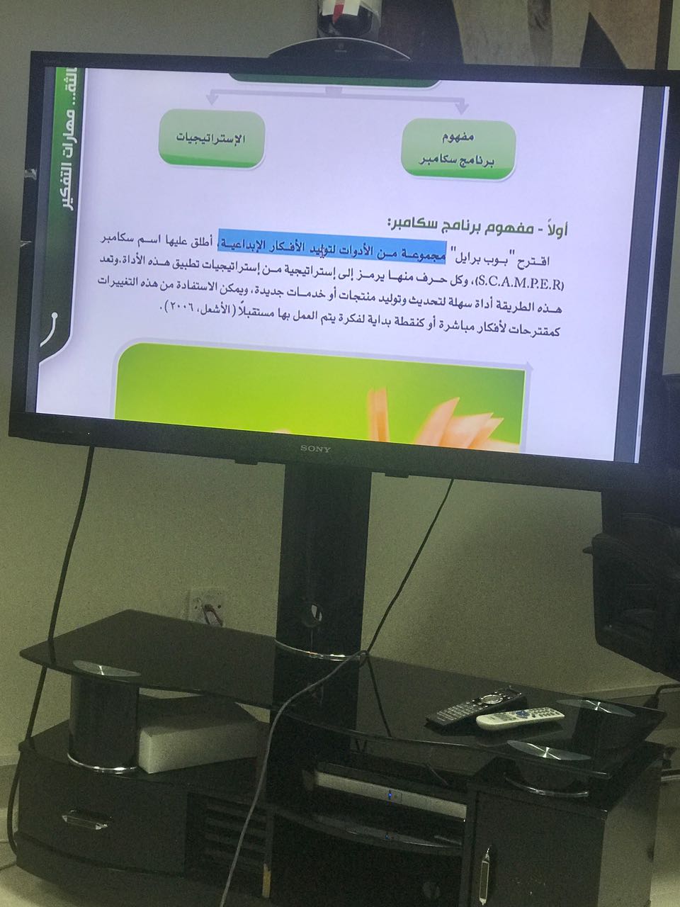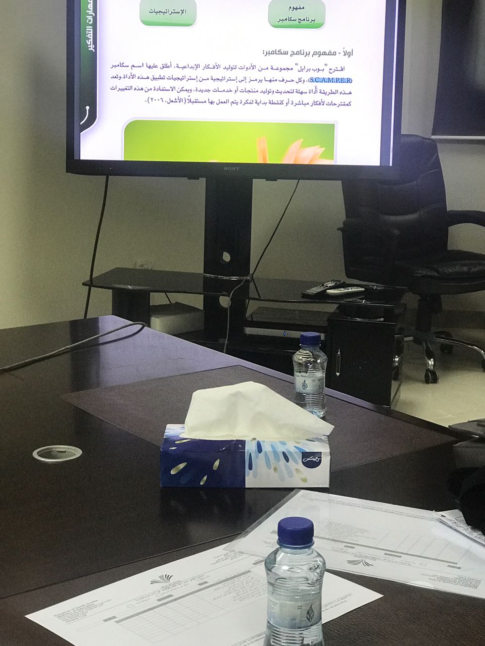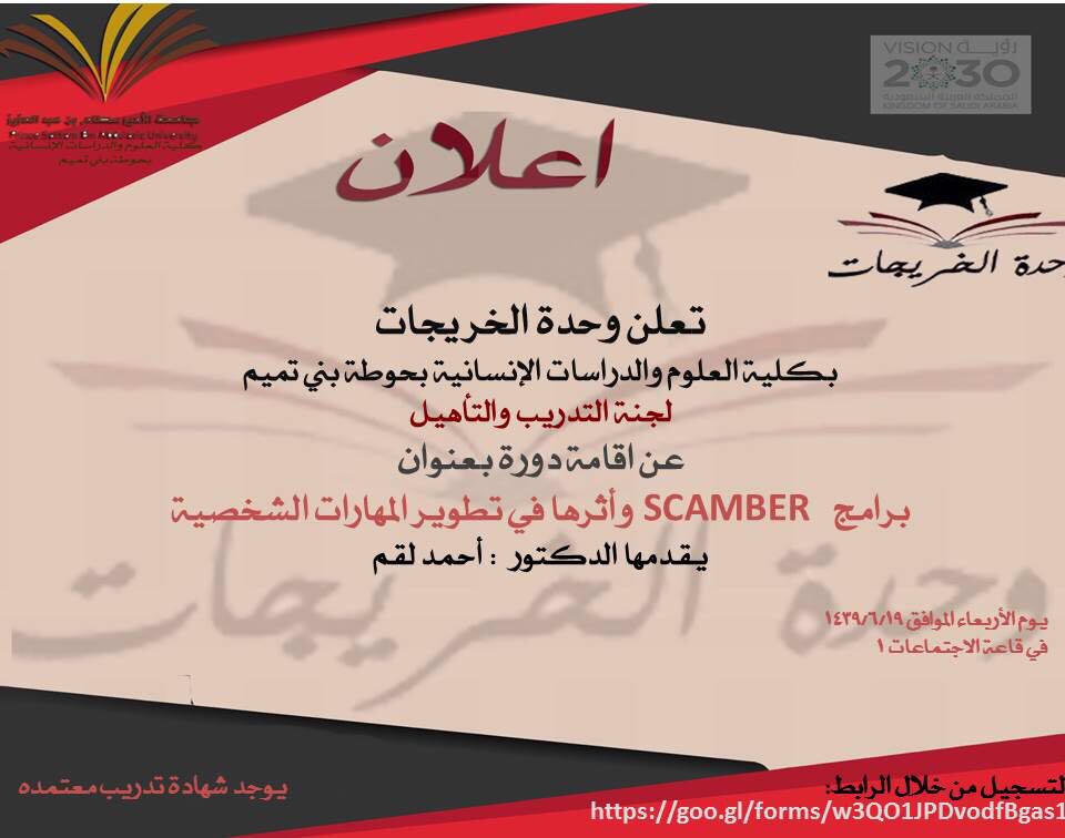 تحت مظلة كلية العلوم والدراسات اﻻنسانية بحوطة بني تميم وإشراف عميدة الكلية الدكتورة حصة بنت سعود الهزاني، أقامت (لجنة التدريب والتأهيل) وحدة الخريجات دورة بعنوان (برامجscamber وأثرها في تطوير المهارات الشخصية) يوم الأربعاء 19/ 6/ 1439هـ. تناولت الدورة التعريف ببرنامج سكامبر وأهم برامج التفكير المختلفة وأثرها في تطوير المهارات وأفضل الطرق لتوليد الأفكار، بالإضافة إلى إعداد برامج التفكير وتنفيذها قدم الدورة د. أحمد لقم وحضر الدورة 15 متدربة.