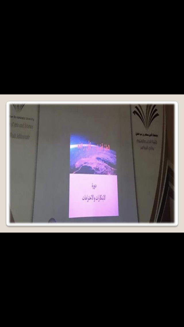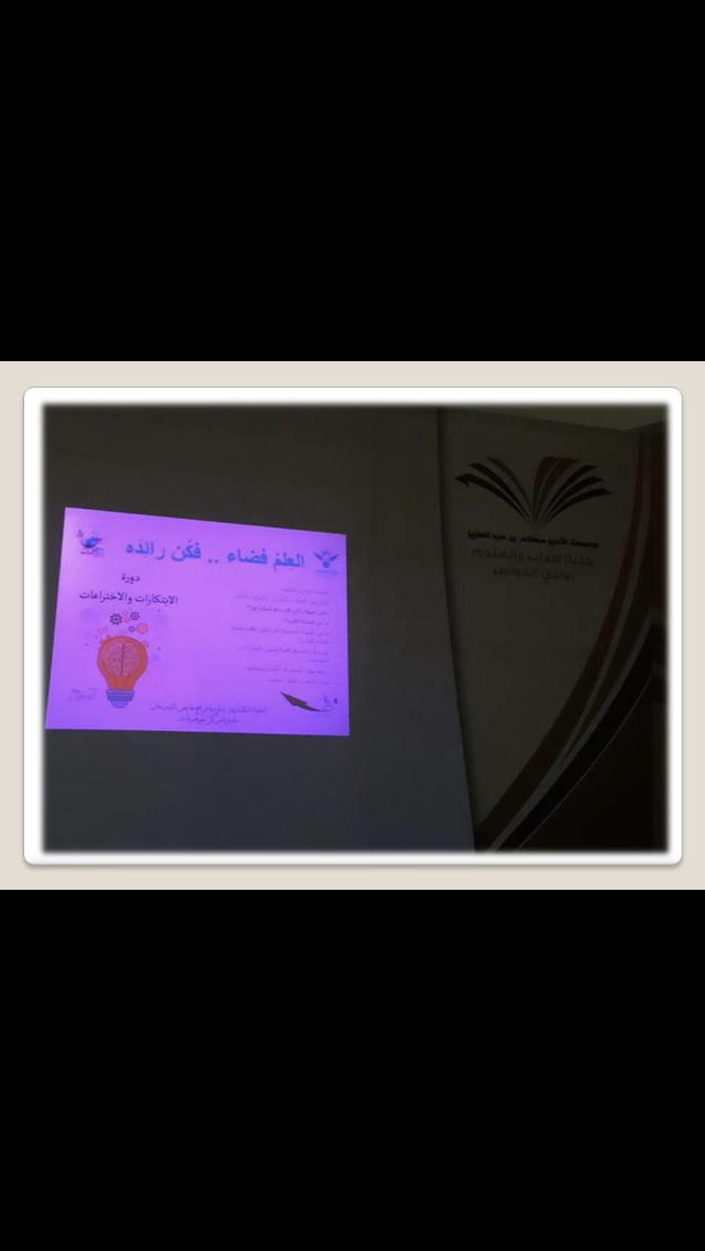 برعاية سعادة عميد كلية الآداب و العلوم بوادي الدواسر الدكتور عمر المطيري و بحضور سعادة وكيلة كلية الآداب و العلوم بوادي الدواسر الأستاذة نورة دليم و بإشراف منسقة الملتقى العلمي الثالث الأستاذة هياء شجاع عقد يوم الثلاثاء 05/23/ 1440هـ الموافق لـ 2019/01/29 م دورة تدريبية بعنوان "العلم فضاء فكن رائده" ضمن محور "الابتكارات و الاختراعات "قدمته المدربة أ. نورة فراج عايض الدرعان مديرة مركز الموهوبات بحضور كل من الطالبات و أعضاء هيئة التدريس حيث عرفت الأستاذة نورة بالإبداع و عناصره و وضحت الفرق بين الاختراع, الابداع و الابتكارات, و تحدثت عن الجهات التي تدعم المخترعين بالإضافة إلى الملكية الفكرية.