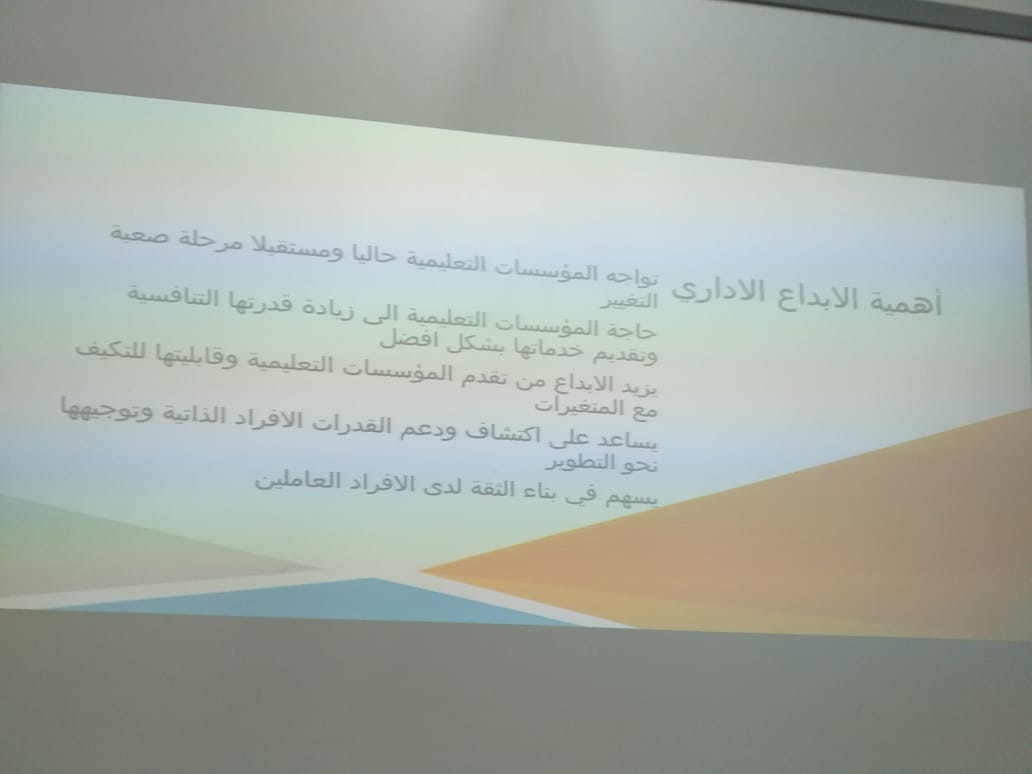 أقامت وحدة التطوير والتنمية المهنية دورة تدريبية بعنوان ( الإبداع الإداري ) ,للدكتورة / حصة ناصر اليحيى, يوم الخميس الموافق4-7-1441هـ. والذي تناولت فيه مفهوم الإبداع,و أنواع الإبداع,ووخصائص وسمات الشخصية المبدعة,و مستويات الإبداع. وغيرها من الموضوعات التي تناولتها الدكتورة في دورتها والمشاركة في الأمثلة و الأنشطة مع المتدربات. كما أجابت على العديد من الاستفسارات. وقد نالت الدورة استحسان جميع المشاركات . وأخيراً تم توزيع شهادات الحضور وشهادة الشكر والتقدير لمقدمة الدورة
