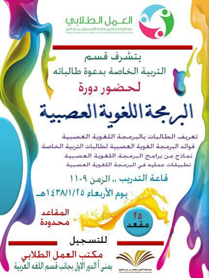 أقامت وحدة العمل الطلابي بكلية التربية بالخرج يوم الأربعاء الموافق 25/1/1438هـ دورة بعنوان " البرمجة اللغوية العصبية " ألقتها الدكتورة/ فايزة إبراهيم أحمد من الساعة 9:00 حتى الساعة 11:00ص تستهدف فيها طالبات قسم التربية الخاصة بحضور (24)طالبة و استهدف البرنامج إكساب الطالبات المهارات المختلفة لعلم البرمجة اللغوية العصبية من خلال المرجعيات النظرية و التطبيقية المعتمدة عليها, ومجالات تطبيق هذا العلم في مجال التربية الخاصة والتعرف على فوائدها, واكتشاف أسرار النجاح لدى الطالبة بأسلوب البرمجة اللغوية العصبية و التفكير الايجابي حيث اشتملت على:-