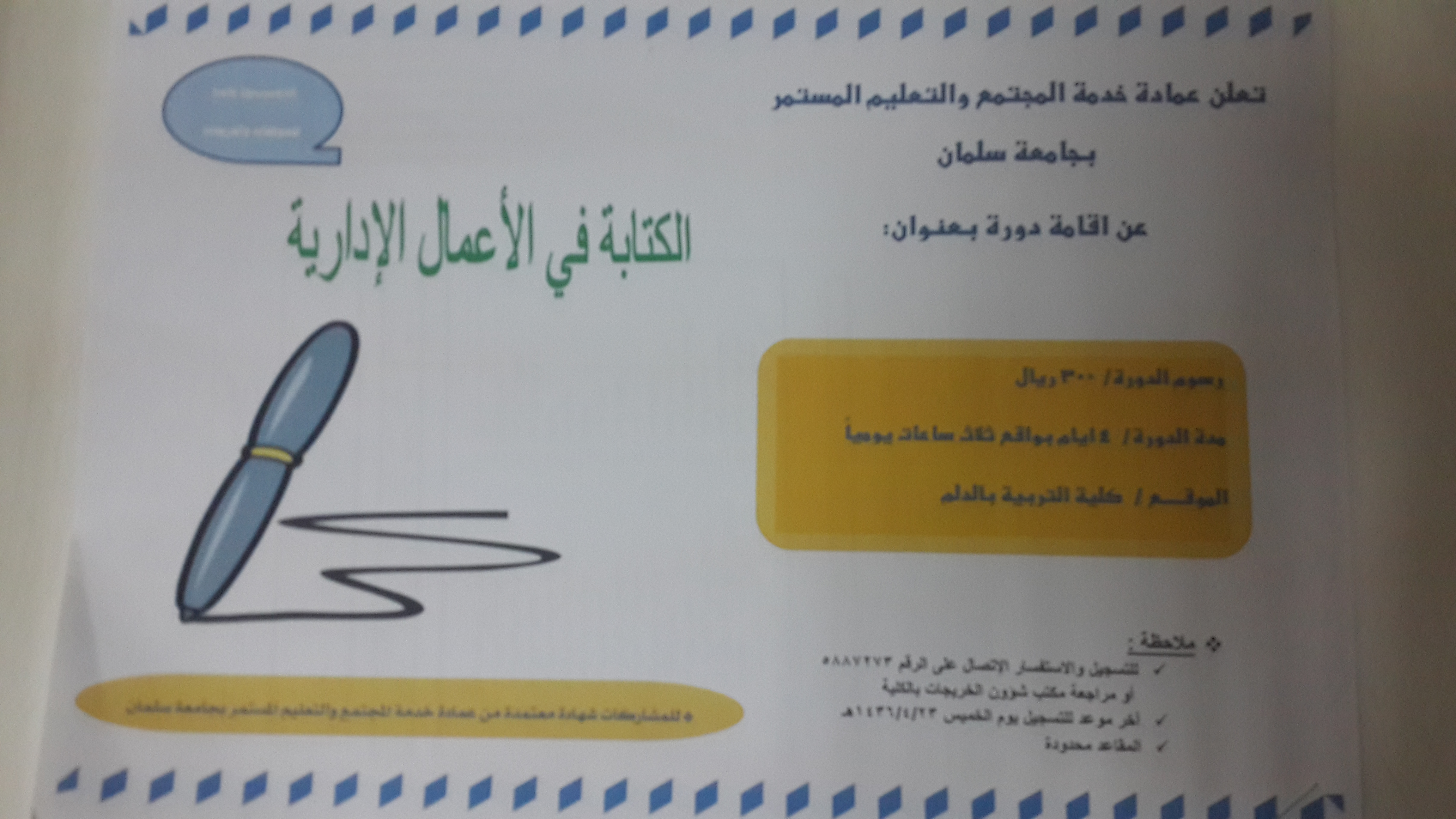 يعلن مكتب شؤون الخريجات بكلية التربية بالدلم عن اقامة دورة بعنوان (الكتابة في الأعمال الإدارية) تحت إشراف عمادة خدمة المجتمع والتعليم المستمر بجامعة سلمان يوم الاثنين الموافق1436/4/27 هـ و لمدة أربعة أيام