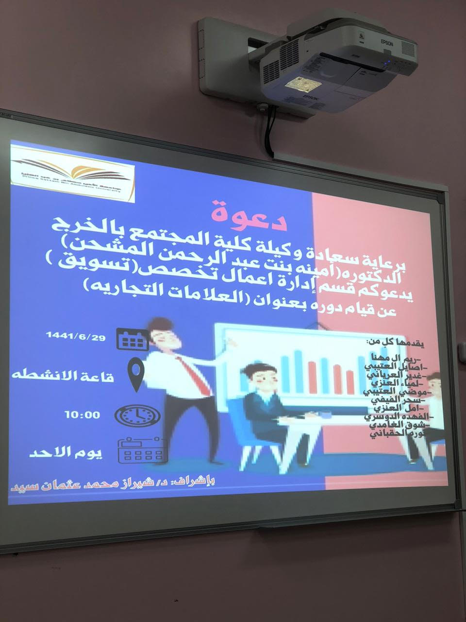 أقام قسم إدارة الاعمال بكلية المجتمع بالخرج وبإشراف مساعده المشرف على قسم إدارة الأعمال بالكلية الدكتورة/ شيراز محمد ؛ وبمشاركة طالبات المستوى الثاني . دورة تدريبية بعنوان (العلامة التجارية) وتم عرض عدد من المحاور كان من أهمها: