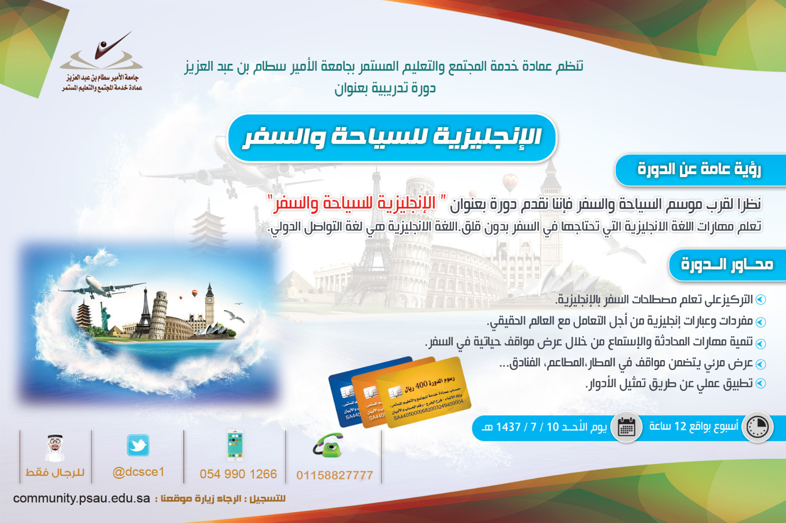 تعلن عمادة خدمة المجتمع و التعليم المستمر بجامعة الأمير سطام بن عبدالعزيز , عن فتح باب التسجيل في البرنامج التدريبي الصيفي " اللغة الإنجليزية لإغراض السياحة " .