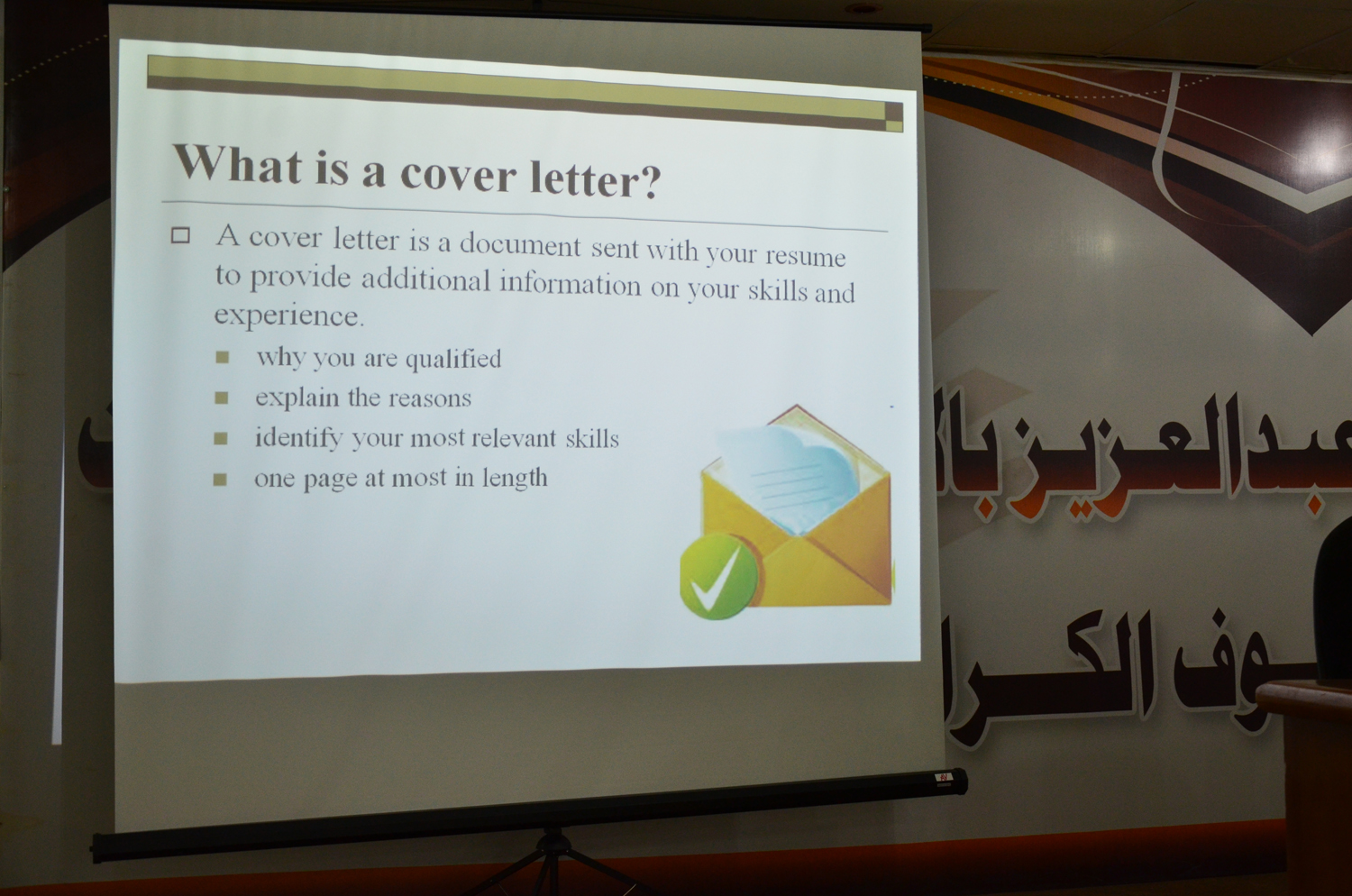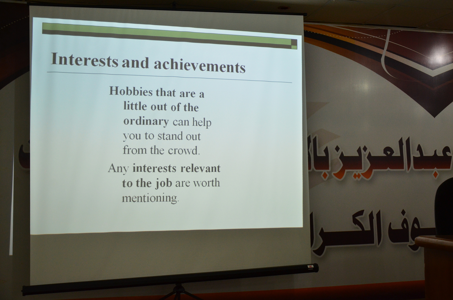 أقامت وحدة الخريجات بكليات الأفلاج (قسم الطالبات) يوم الأثنين 1441/2/8هـ الساعة التاسعة صباحاً في المسرح دورة بعنوان (السيرة الذاتية و المقابلة الشخصية باللغة الإنجليزية) قدمتها د. بتول أحمد، تحدثت فيها عن كيفية كتابة السيرة الذاتية باللغة الإنجليزية، ومعرفة المحتويات المتضمنة بالسيرة الذاتية من معلومات شخصية، و مؤهلات أكاديمية، وخبرات، و مهارات مكتسبة، و أشخاص يمكن الرجوع إليهم، كما بيّنت أهمية خطاب التعريف و كيفية كتابته، ثم ذكرت طرق وأساليب اجتياز المقابلة الشخصية بنجاح، واختتمت الدورة بالإجابة عن استفسارات الطالبات.