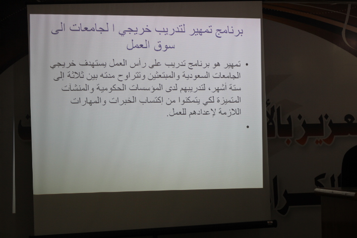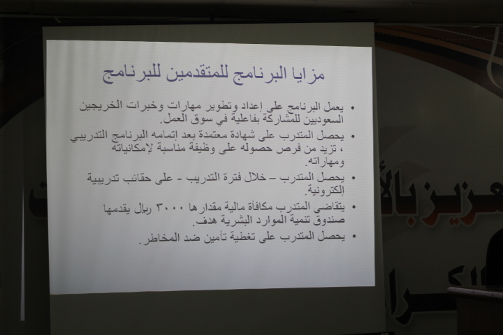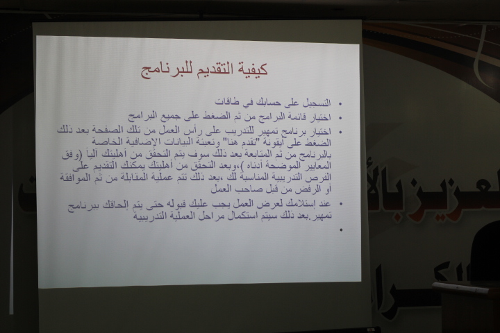 نظمت وحدة الخريجات بكليات الأفلاج (قسم الطالبات) يوم الأربعاء 1441/2/24هـ الساعة التاسعة صباحاً في المسرح دورة بعنوان (التعريف ببرنامج تمهير) قدمتها د. إنعام بشير الفضل يوسف، وتهدف الدورة إلى التعريف ببرنامج تمهير، وبيان مزايا البرنامج للمتقدمين، وإيضاح معايير الأهلية وكيفية التقديم، ثم تناولت متطلبات البرنامج وتفاصيله من حيث المدة التي يستغرقها، والمكافأة الشهرية للمتدرب، وشروط استحقاق الشهادة التدريبية، كما ذكرت طريقة تعبئة البيانات في موقع (طاقات) للتسجيل في برنامج تمهير، واختتمت الدورة بالإجابة عن استفسارات الطالبات.
