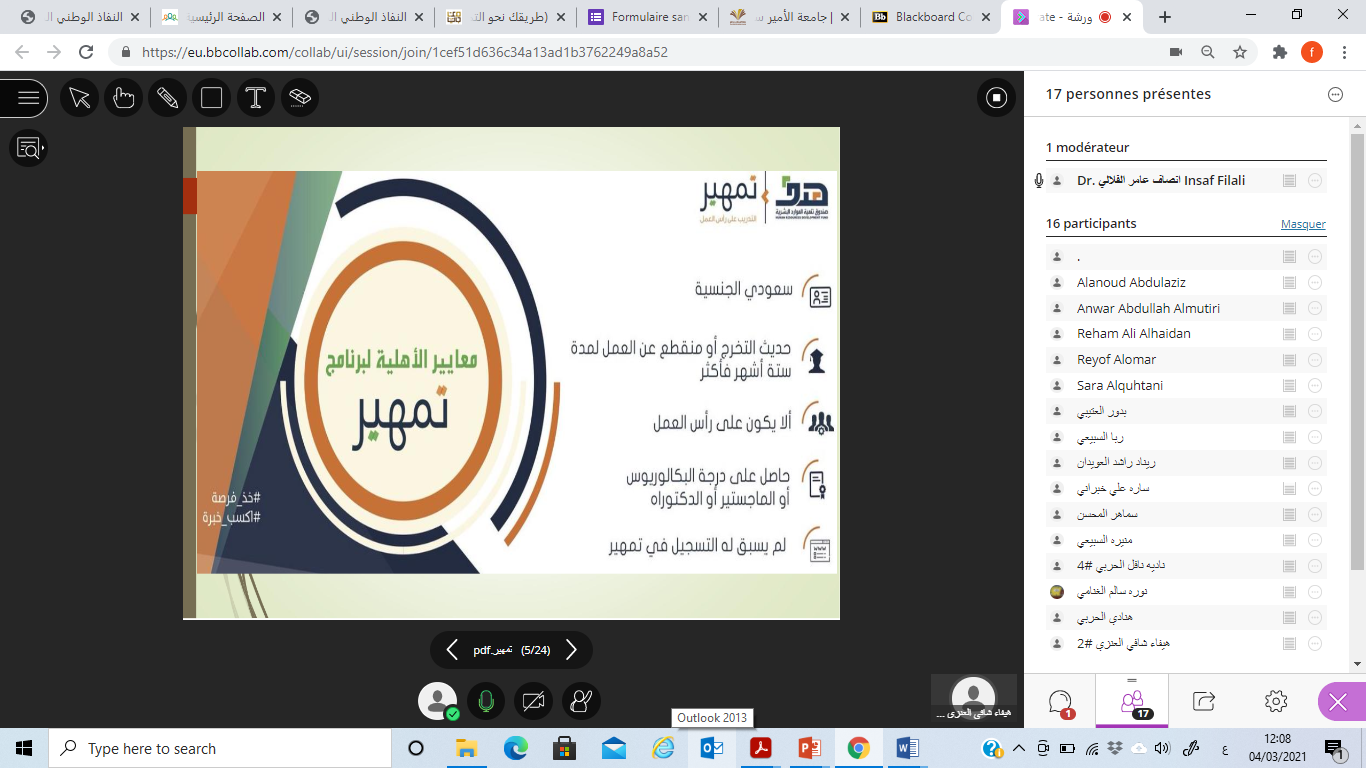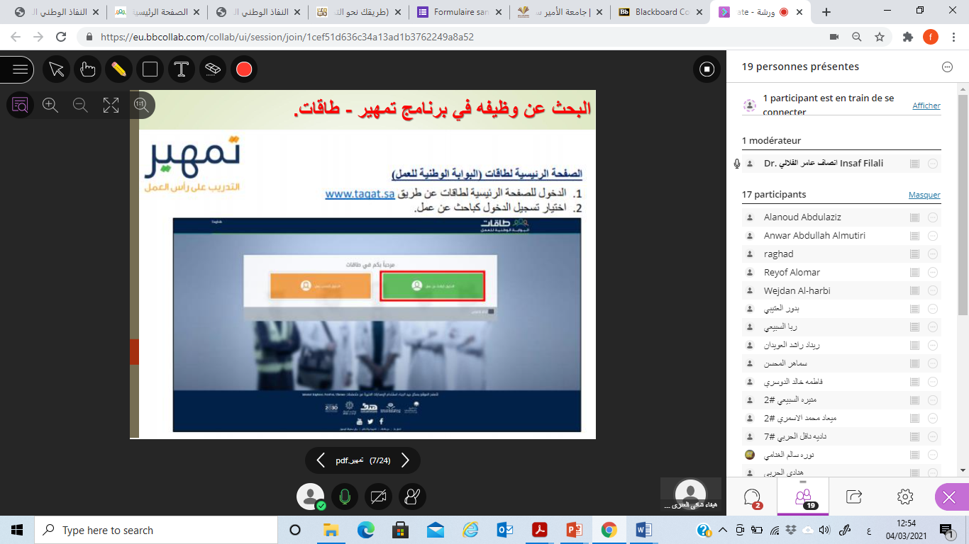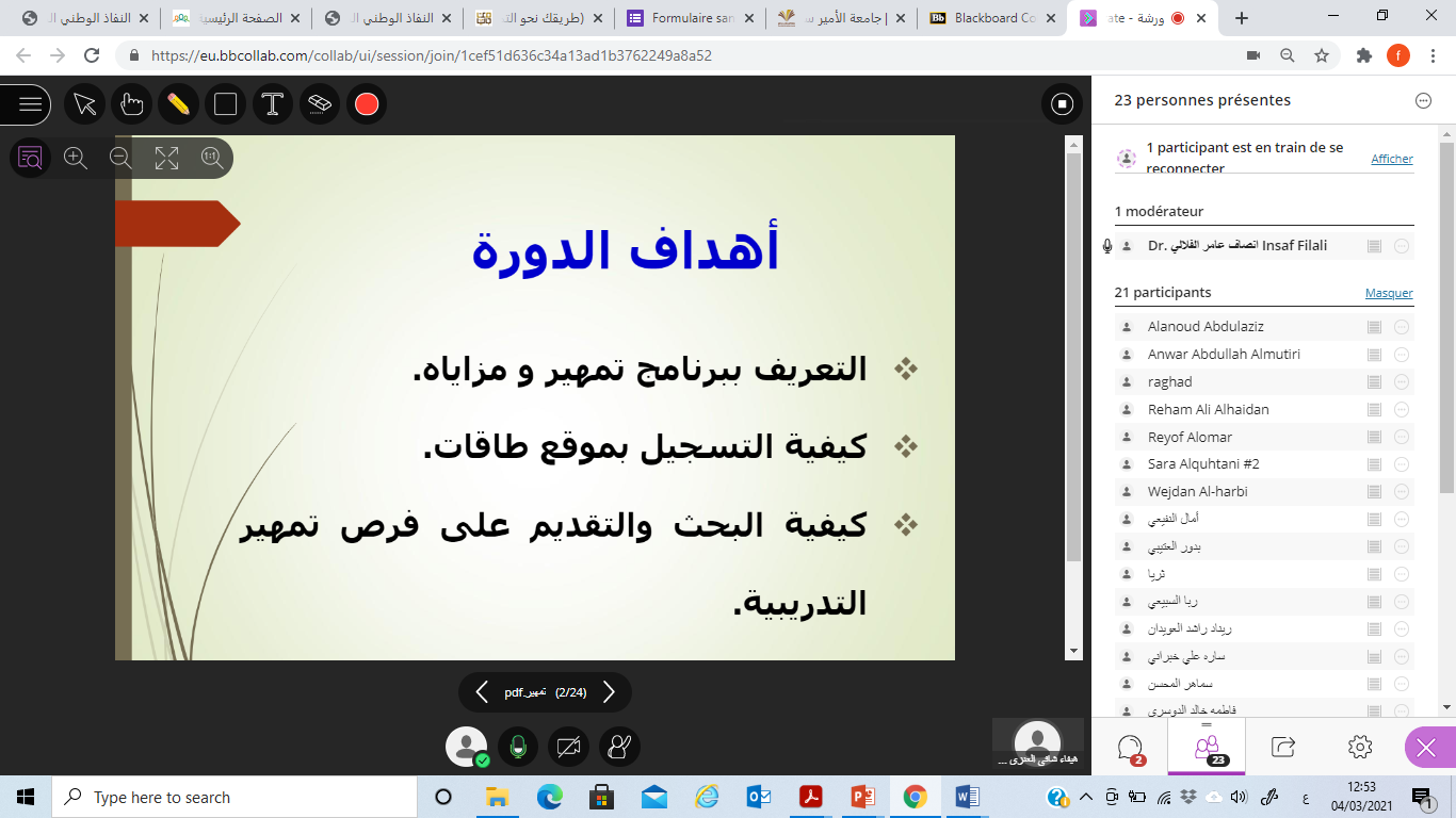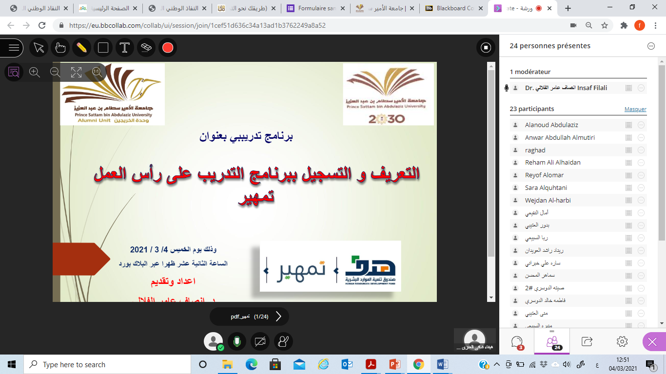 وقد تم من خلال الدورة التعريف ببرنامج تمهير وكيفية البحث والتقديم على فرص تمهير التدريبية كما تم تسليط الضوء على شروط ومزايا الانتفاع بهذا البرنامج وكذلك تم توضيح خطوات التسجيل في البوابة الوطنية للعمل طاقات التي تتيح فرص عمل للخريجات أثناء التقديم تمت مناقشة أفكار الطالبات وملاحظاتهم ومحاولة الإجابة عن تساؤلاتهم.