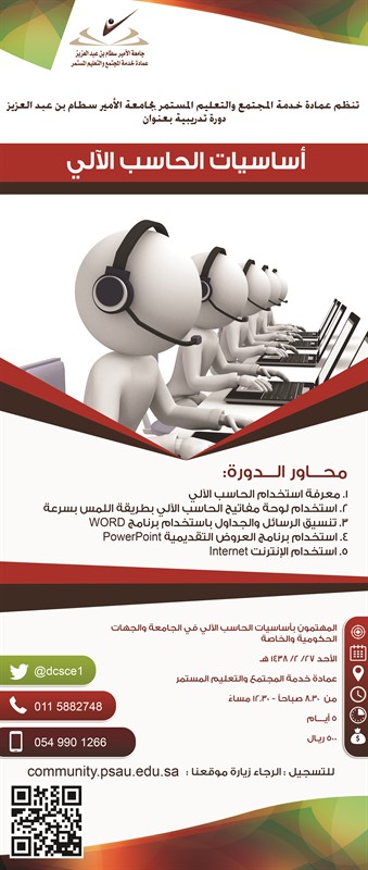 تعلن عمادة خدمة المجتمع و التعليم المستمر عن بدء التسجيل في دورة : أساسيات الحاسب الآلي و التي تنطلق صباح يوم الأحد 27/2/1438 ولمدة 5 أيام بواقع 20 ساعة تدريبية من الساعة 8.30 ص إلى 12.30 م .
