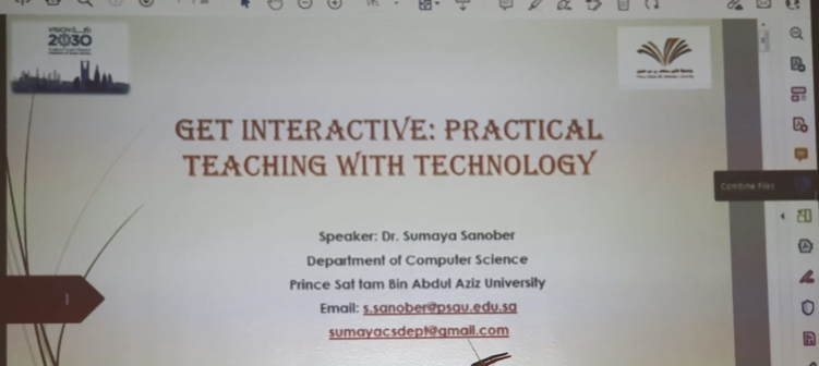 أقامت وحدة التطوير والتميز بقسم علوم الحاسب بكلية الآداب والعلوم بوادي الدواسر دورة في التدريس العملي التفاعلي بالتكنولوجيا وذلك يوم الاثنين الموافق 20/7/1443 هـ للدكتورة سمية سانوبر محاضرة بالقسم. علوم الحاسب ، بدأت الورشة في الساعة 8:30 صباحاً في مبنى الكلية.