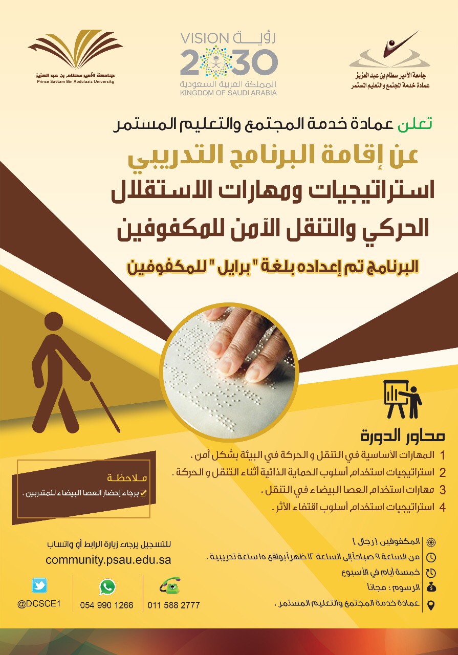 تعلن عمادة خدمة المجتمع والتعليم المستمر عن إقامة البرنامج التدريبي للمكفوفين بعنوان