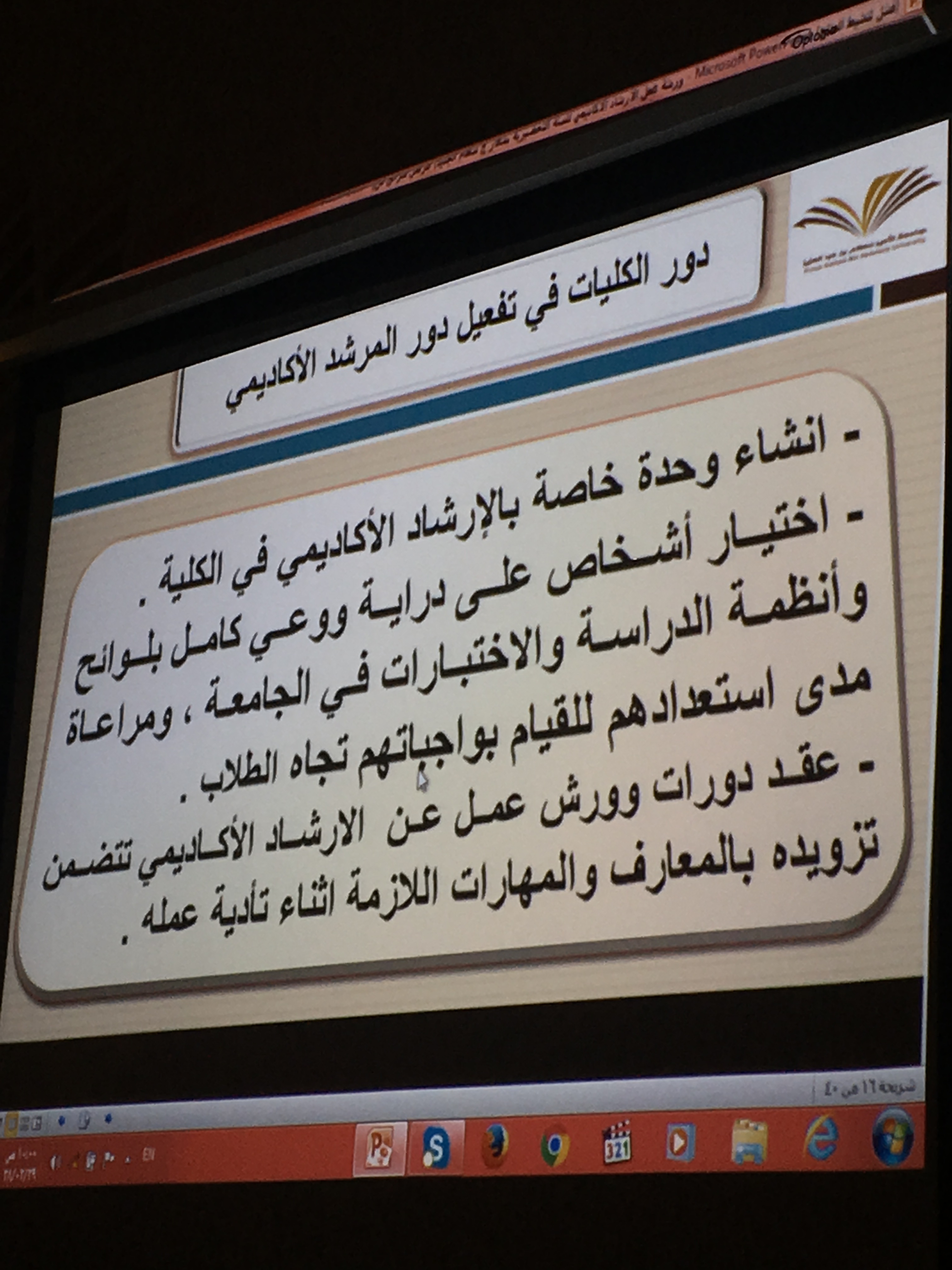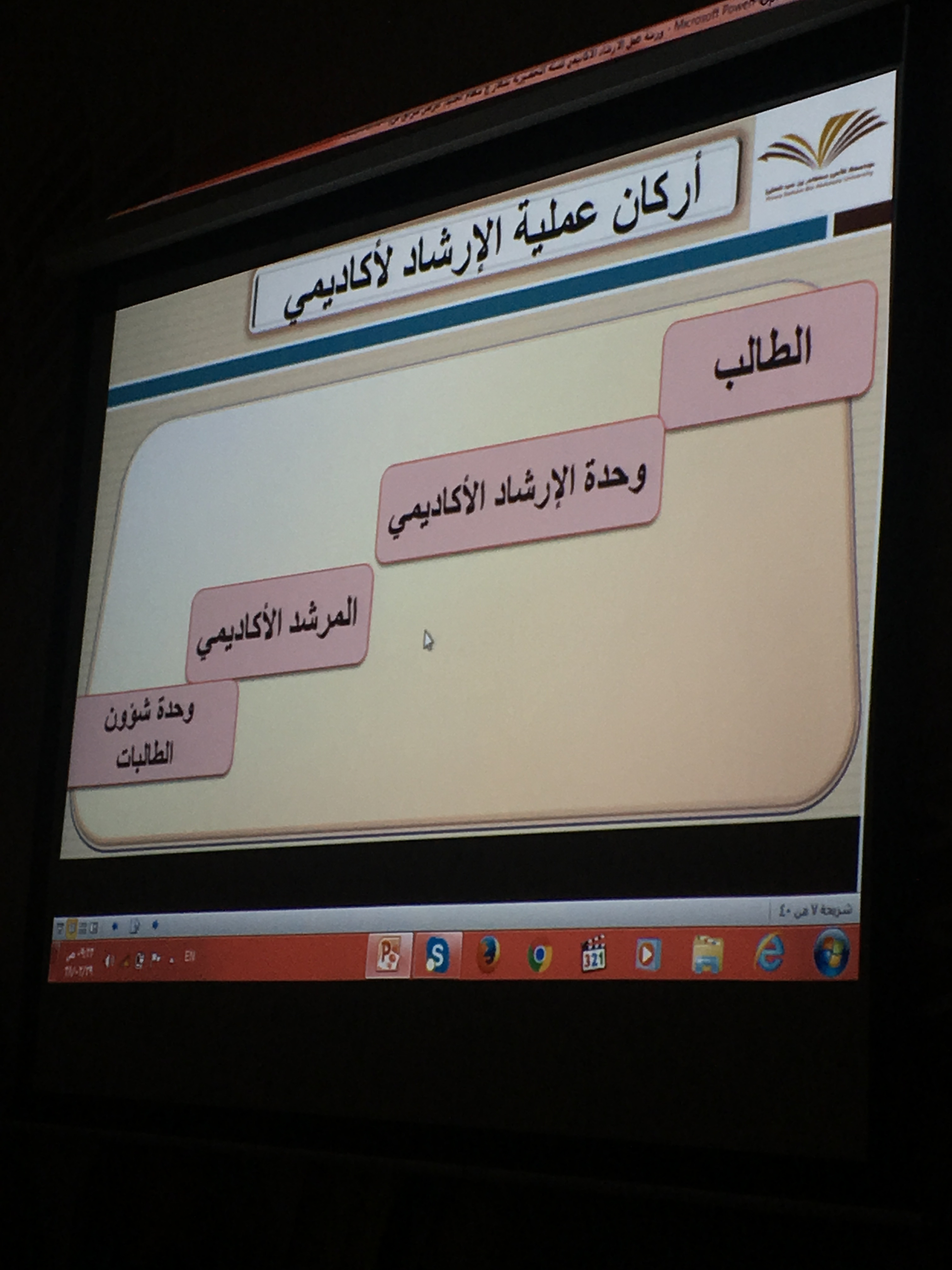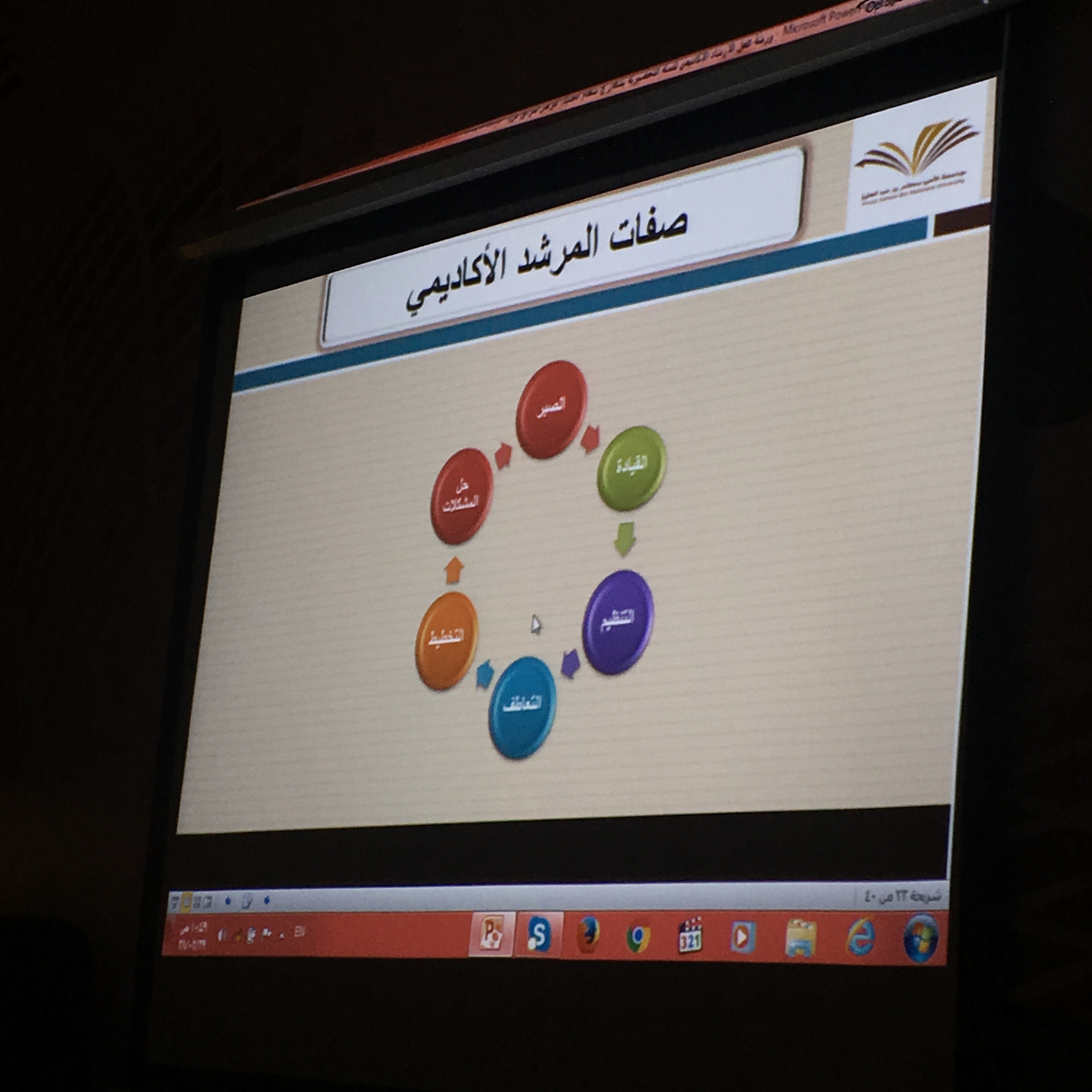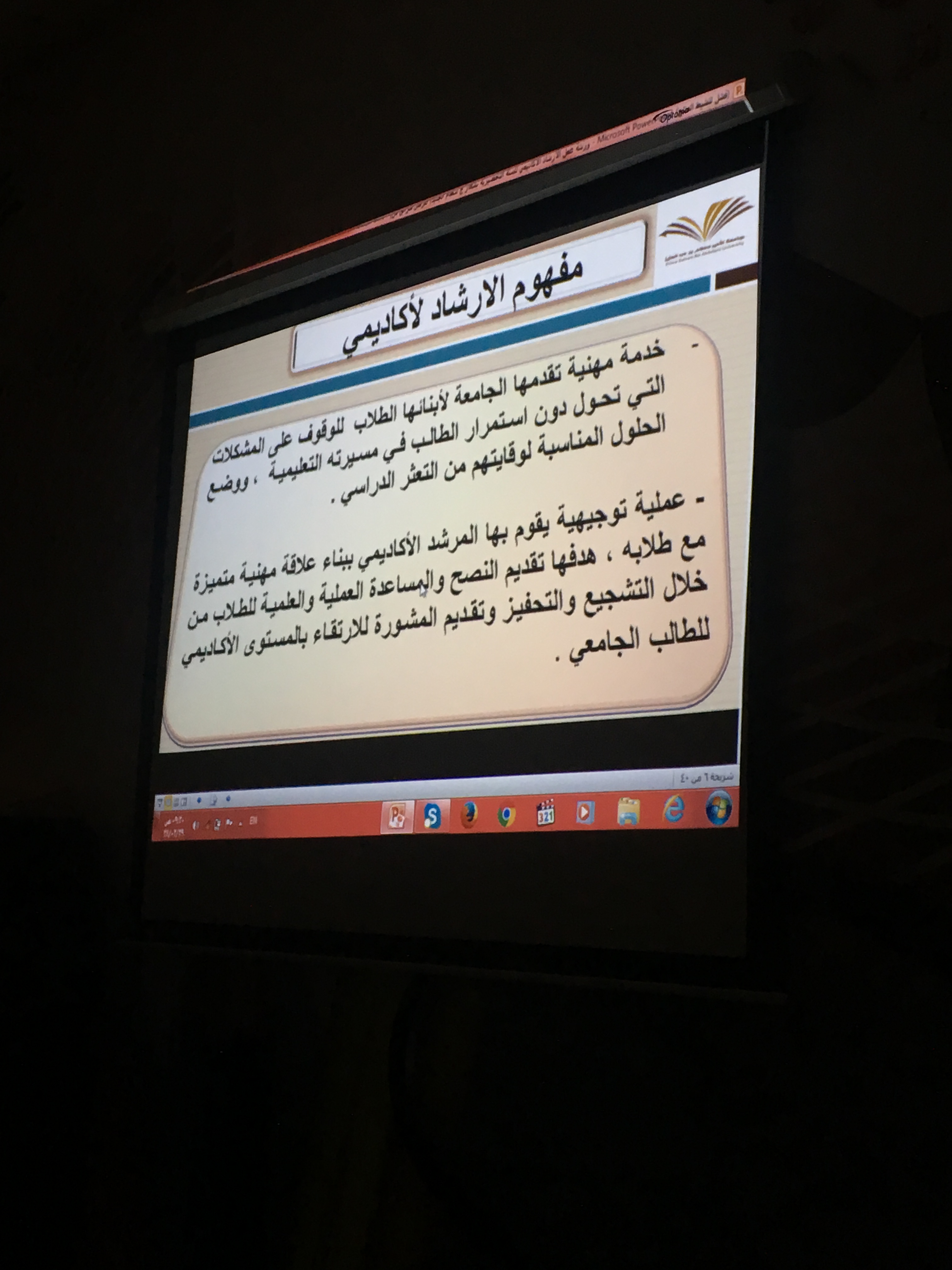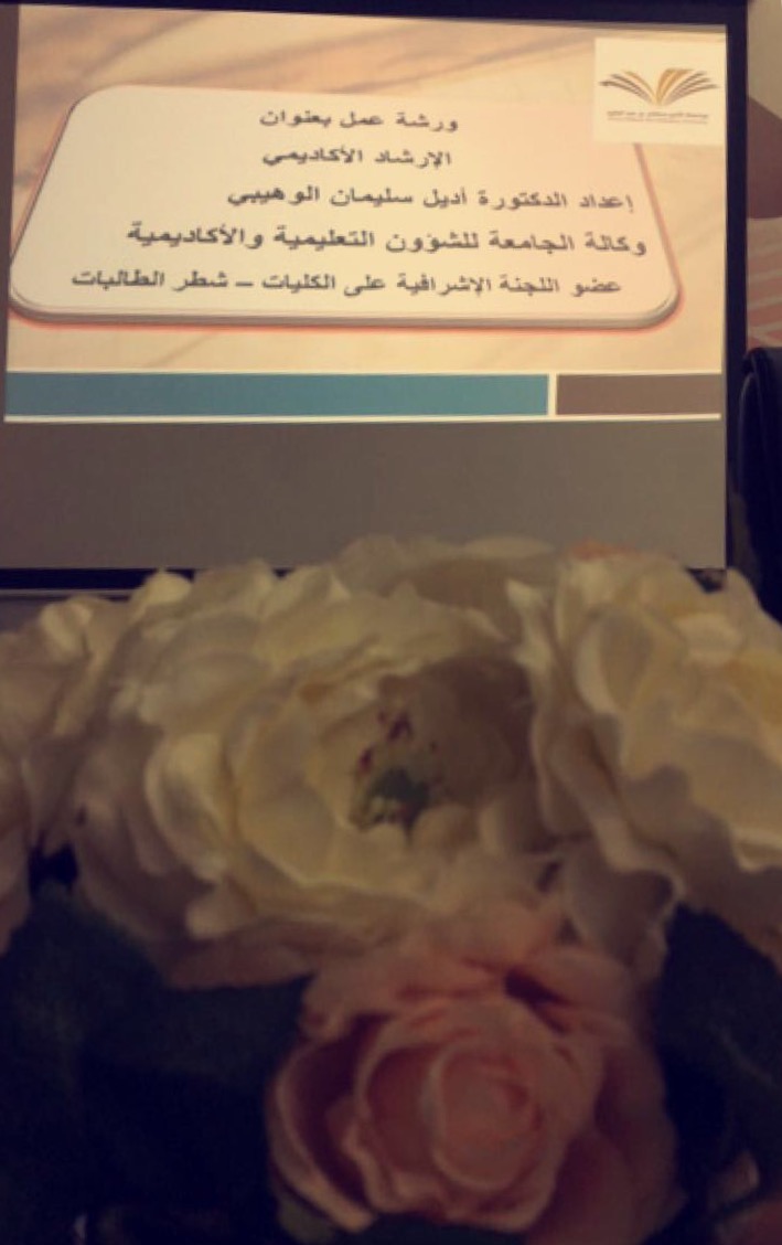 نظمت عمادة السنة التحضيرية /طالبات بالتعاون مع الوحدة الأشرفية على كليات البنات بجامعة سطام بن عبدالعزيز دورة بعنوان (الارشاد الاكاديمي) للدكتورة أديل وهيبي وذلك يوم الثلاثاء الموافق 27/2/1438هـ