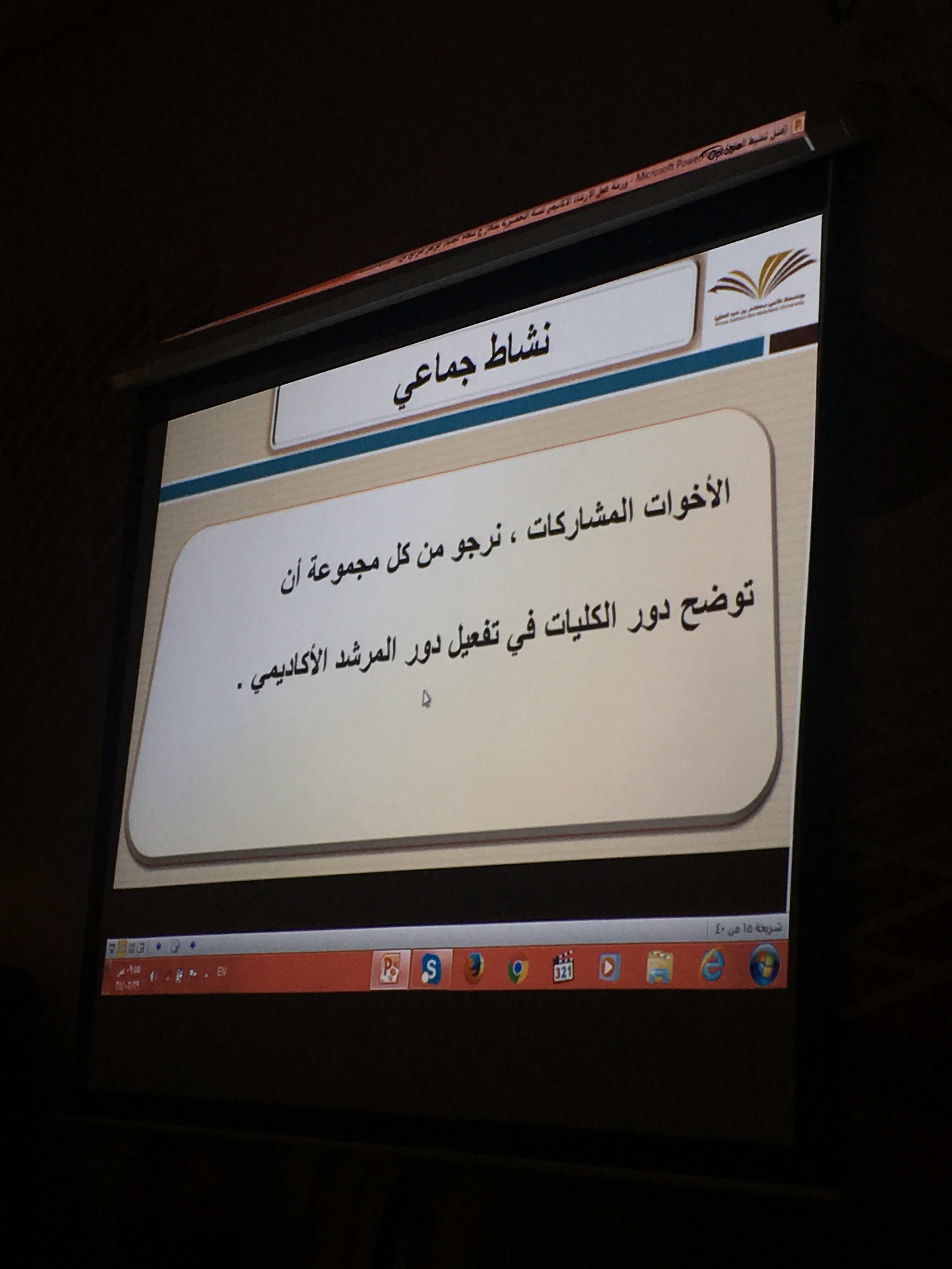 وقد تناولت الدكتورة أديل وهيبي أهمية الارشاد الاكاديمي موضحة أنه يعد من أهم أسس النظام بالجامعة ثم بعدها شرحت مفهوم الارشاد الاكاديمي بأنه خدمة مهنية تقدمها الجامعة لأبنائها الطلاب للوقوف على مشكلات التي تحول دون استمرار الطالب في سيرته التعليمية ووضع الحلول المناسبة لوقايتهم من التعثر الدراسي , و تناولت أركان عملية الإرشاد الاكاديمي وأنها مبنية على الطالب , بعدها تم طرح عدد من الأنشطة الجماعية للمتدربات لمناقشة أهداف الارشاد الاكاديمي ومفهومه وفلسفته ودور الكليات في تفعيل دور المرشد الاكاديمي ،وشرح مرجعيات المرشد الاكاديمي وبعض مفاهيم المهمة للطالب مثل الاعتذار وتأجيل الدراسة والانقطاع , وتطرقت الدكتورة إلى مهارات التعامل مع استفسارات الطالبات بعد ذلك تم عمل نشاط جماعي طلبت الدكتورة أديل من المتدربات اقتراحاتهم لمعالجة معوقات الإرشاد الاكاديمي والتغلب عليها.