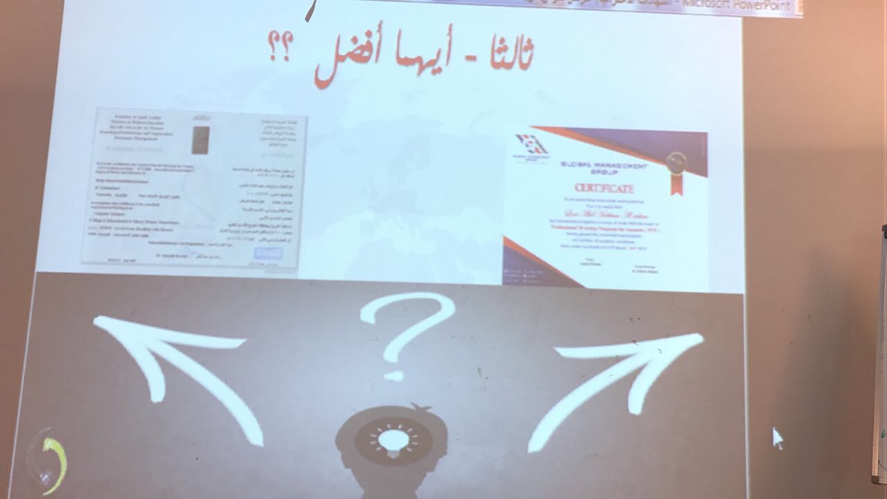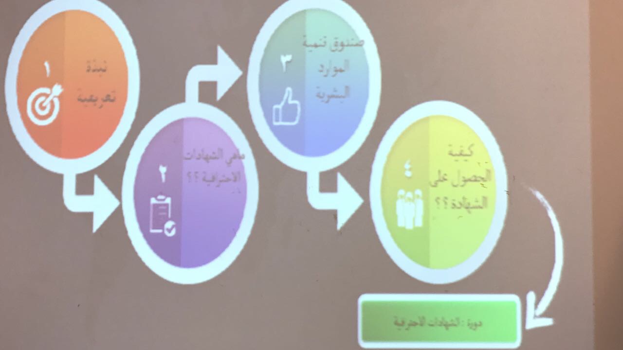عقدت لجنة التأهيل والتدريب في وحدة الخريجات بكلية التربية بالخرج تحت إشراف الأستاذة بتول العنزي دورة بعنوان ( الشهادات الاحترافية ) للأستاذة صباح سعيد الشهري وكان من أهم أهداف الدورة التعريف العام بالشهادات الاحترافية و الاستفادة من الدعم المالي المقدم من صندوق تنمية الموارد البشرية وقد لاقت حضوراً فعالاً من الطالبات و الخريجات .