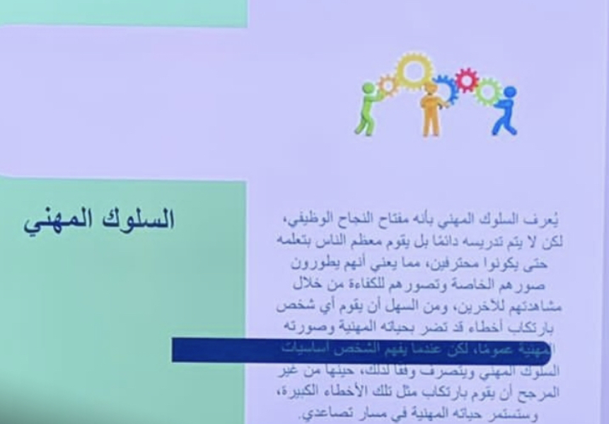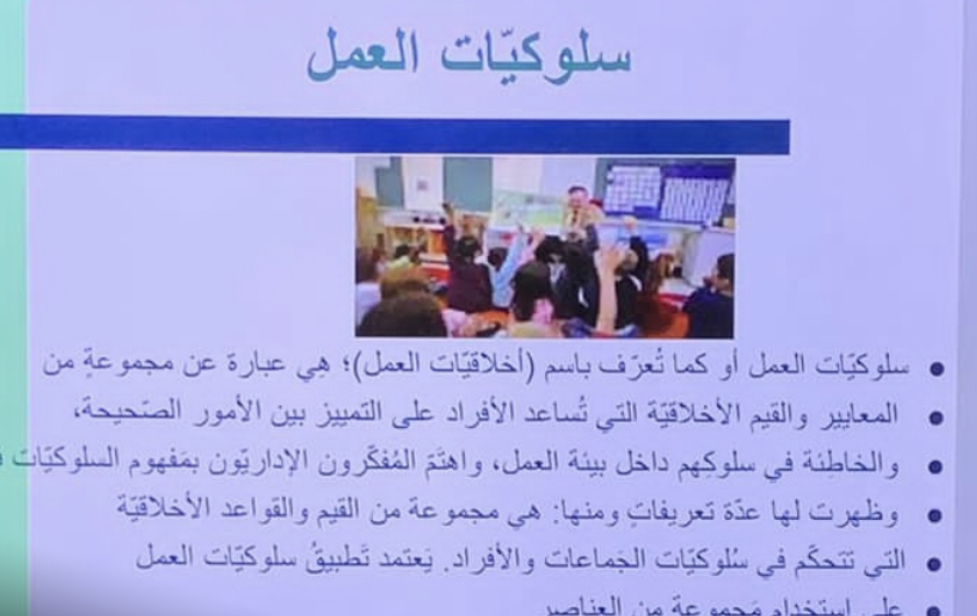 كان التركيز الرئيسي لورشة العمل على سلوكيّات العمل أو كما تُعرّف باسم (أخلاقيّات العمل) هِي عبارة عن مجموعةٍ من المعايير والقيم الأخلاقيّة التي تُساعد الأفراد على التمييز بين الأمور الصّحيحة،