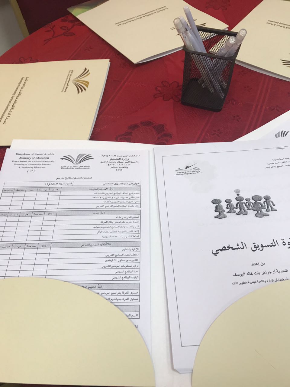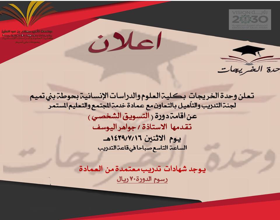 أقامت لجنة التدريب والتأهيل بوحدة الخريجات في كلية العلوم والدراسات الإنسانية بحوطة بني تميم وبالتعاون مع عمادة خدمة المجتمع والتعليم المستمر دورة بعنوان (التسويق الشخصي) يوم الأثنين 16 / 7 / 1439 هـ في قاعة التدريب. قدمت الدورة أ.جواهر اليوسف و تناولت فيها أهمية التسويق الشخصي وكيفية وضع خطة ناجحة للتسويق وأهمية جمع المعلومات التسويقية واستثمار نقاط القوة في عملية التسويق الشخصي. استمرت الدورة أربع ساعات حيث حضر الدورة ٢٥ متدربة وخريجات ومتوقع تخرجهن.