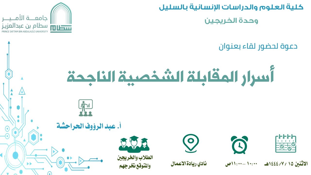 نظمت وحدة الخريجين بكلية العلوم والدراسات الإنسانية بالسليل متمثلة في مجال التأهيل الوظيفي دورة بعنوان (اسرار المقابلة الشخصية الناجحة)، وذلك يوم الاثنين بتاريخ 15/ 7 /1444هـ الموافق 6/ 2 /2023 م بنادي ريادة الاعمال، وكانت الدورة موجهة بالدرجة الأولى للطلاب الخريجين والمتوقع تخرجهم وقد قام بتقديم الدورة الاستاذ عبد الرؤوف الحراحشة المحاضر بقسم اللغة الإنجليزية، وقد هدفت الدورة إلى: التعريف بالمقابلة الشخصية , طرق الاستعداد للمقابلة الشخصية , أنواع المقابلة الشخصية , نصائح مهمة للطلاب عند المقابلة الشخصية.