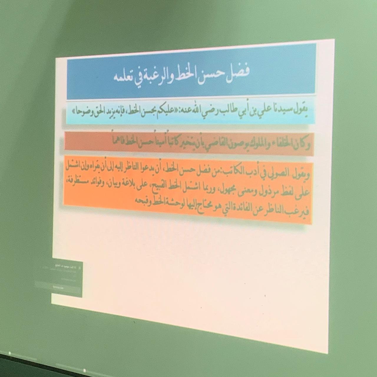 أقام قسم اللغة العربية تحت مظلة وحدة العمل الطلابي دورة بعنوان (فن الخط العربي) للدكتور/ علي البيومي,يوم الأثنين الموافق 23 / 6/ 1441هــ. وتهدف الدورة لخلق بيئة تنافسية في تحسين الخط العربي للطالبات,و الدعوة إلى المحافظة على الخط العربي ورسم قاعدة ,و ربط الطالبات بلغتهم وعربيتهم,و إظهار جماليات الخط العربي لدى الطالبات ,والدعوة إلى الجمال من خلال الربط بين الشكل والمعنى. وقد بلغ عدد الحضور للدورة 23 طالبة.