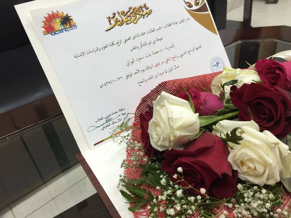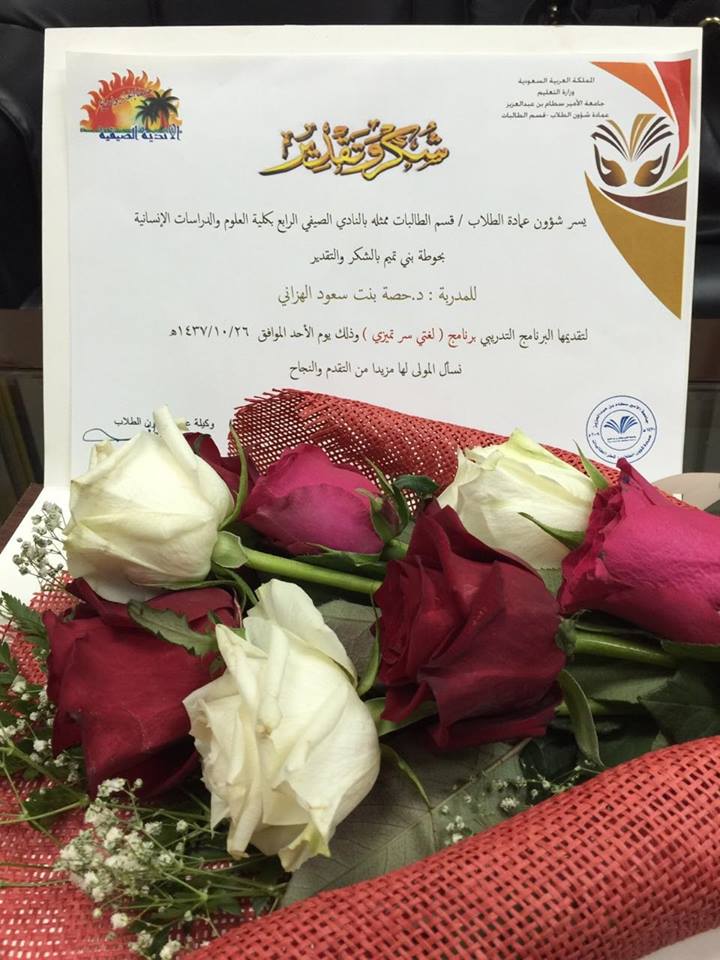 ضمن فعاليات النادي الصيفي الرابع أقيمت يوم الأحد 26/10/1437هـ دورة بعنوان "لغتي سر تميزي" بكلية العلوم والدراسات الانسانية بحوطة بني تميم ،قدمتها عميدة الكلية د. حصة الهزاني تحدثت فيها عن ماهية اللغة العربية ، وطبيعتها ونشأة اللغات وفصائل اللغة ،وبينت أن اللغة العربية من فصيلة اللغات السامية ، ثم تطرقت إلى مزايا اللغة العربية مدعمة حديثها بالأمثلة والنماذج تلا ذلك تطبيقات على الإعجاز البلاغي ، و بلاغة الرسول الكريم صلى الله عليه وسلم.