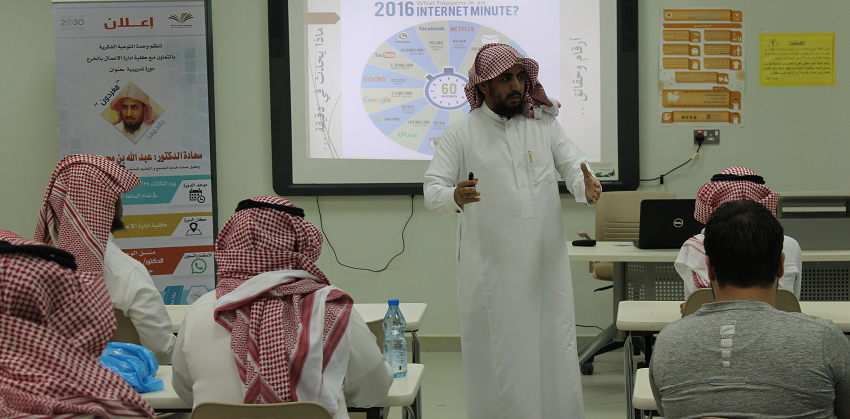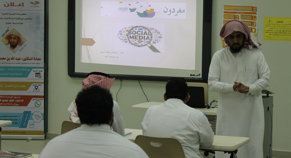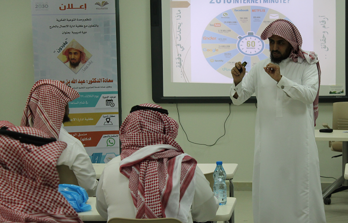 نظمت لجنة الأنشطة الطلابية بالتعاون مع وحدة التوعية الفكرية بالجامعة ضمن مشروع (نحو جامعة واعية) دورة تثقيفية توعوية بعنوان " مغردون " ،قدمها سعادة الدكتور عبدالله بن محمد السبيعي ،وكيل عمادة خدمة المجتمع والتعليم المستمروالتي استعرض خلالها تعريف بأنواع وسائل التواصل الإجتماعي المختلفة مستعرضاً حقائق وأرقام هامة حول إستخدماتها ، ثم تطرق سعادته إلى عرض إيجابيات وسائل التواصل في سرعة نشر الأخبار والمعلومات واستثمارها في التعليم والمعرفة وبيان سلبياتها كالإدمان وضياع الكثير من الأوقات عليها ، والانحراف الفكري وبث الأفكار الضالة وكذلك الابتزاز الإلكتروني مع ذكر وسائل وأدوات تفيد المستخدم في تجنب السلبيات وتعظيم الإستفادة منها . وفي الختام قدم سعادة الدكتور طارق توفيق الخطيب ، رئيس لجنة الأنشطة الطلابية شكره وتقديره للإستجابة السريعة للدكتور عبدالله السبيعي نظراً لأهمية الموضوع في تشكيل الفكر المستقيم الواعي لدى الطالب الجامعي . كما قدم شكره لوحدة التوعية الفكرية وعلى رأسها سعادة الأستاذ الدكتور خالد الدبيان لدعمه المتواصل وتعاونه البناء في ما يخص النشاط الطلابي والتوعية الفكرية .