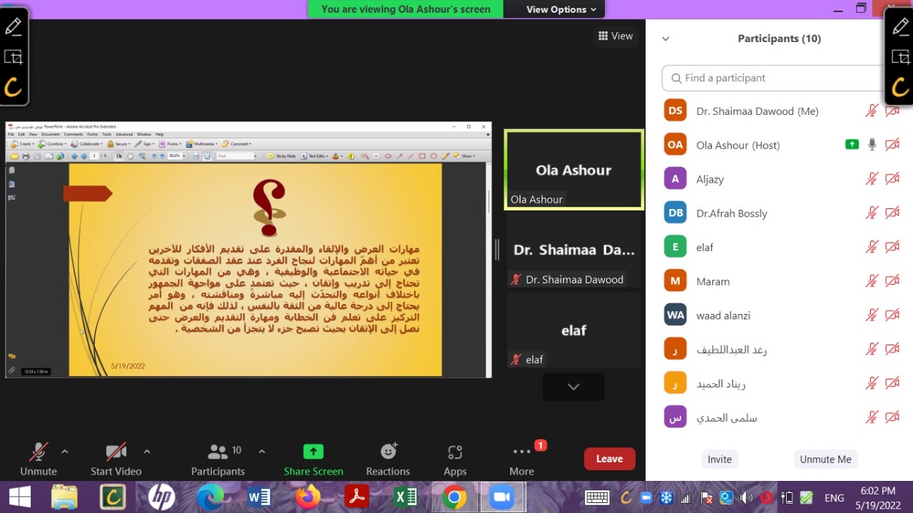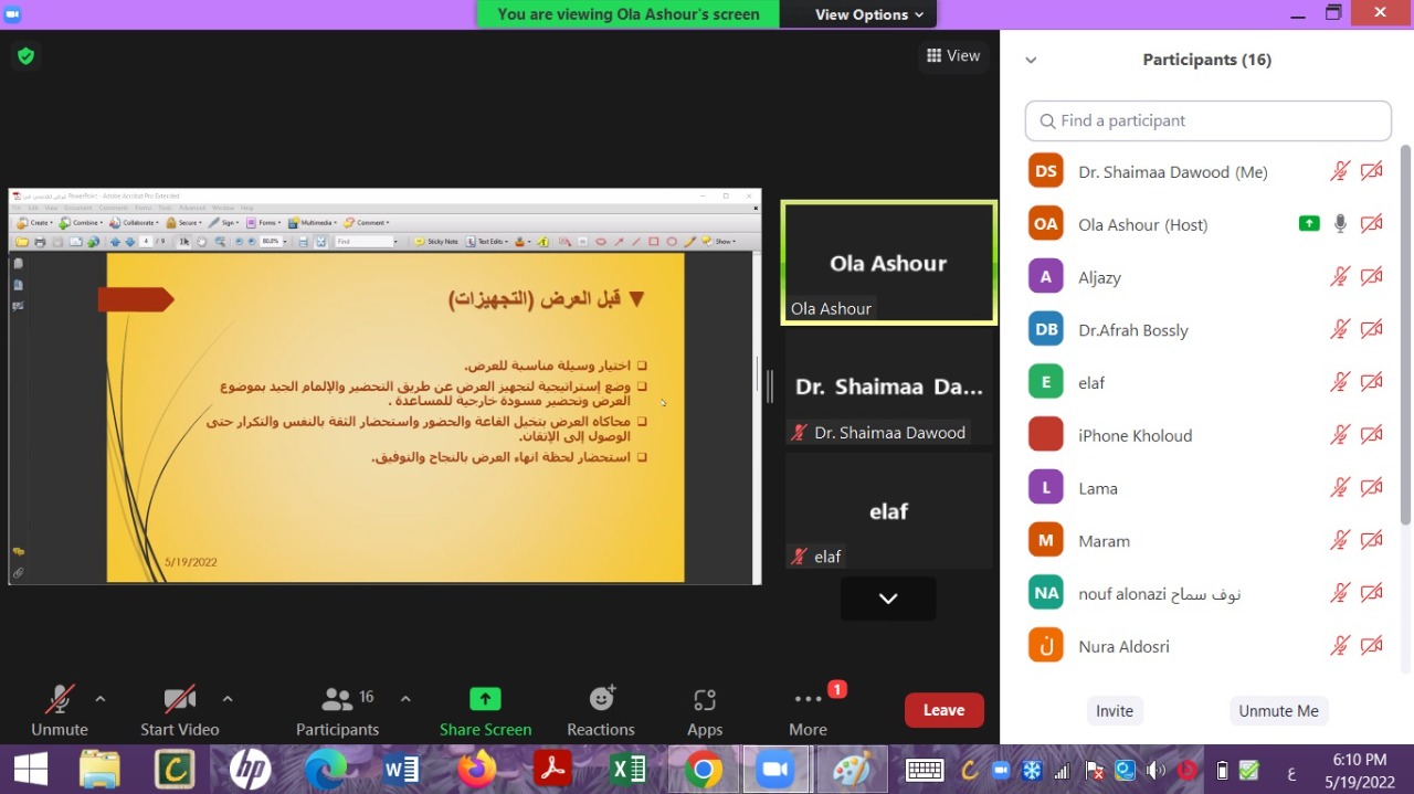 وقد افتتحت الدورة بتعريف الطالبات بأهمية مهارات العرض الفعال والالقاء والمقدرة على تقديم الأفكار للآخرين وهي من المهارات التي تحتاج إلى تدريب وإتقان ثم انتقلن بعدها إلى كيفية مواجهة الجمهور، وتم اختتام هذا اللقاء بفتح باب النقاش والاجابة على أسئلة واستفسارات الطالبات اللي كان مرحب بها، كما تقدمت الطالبات بالشكر لمقدمات هذه الدورة د. علا عاشور و د. شيماء داوود على هذه الدورة الرائعة ورحبن بالمزيد من إقامة مثل هذه الدورات.