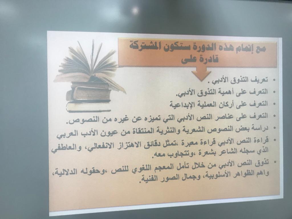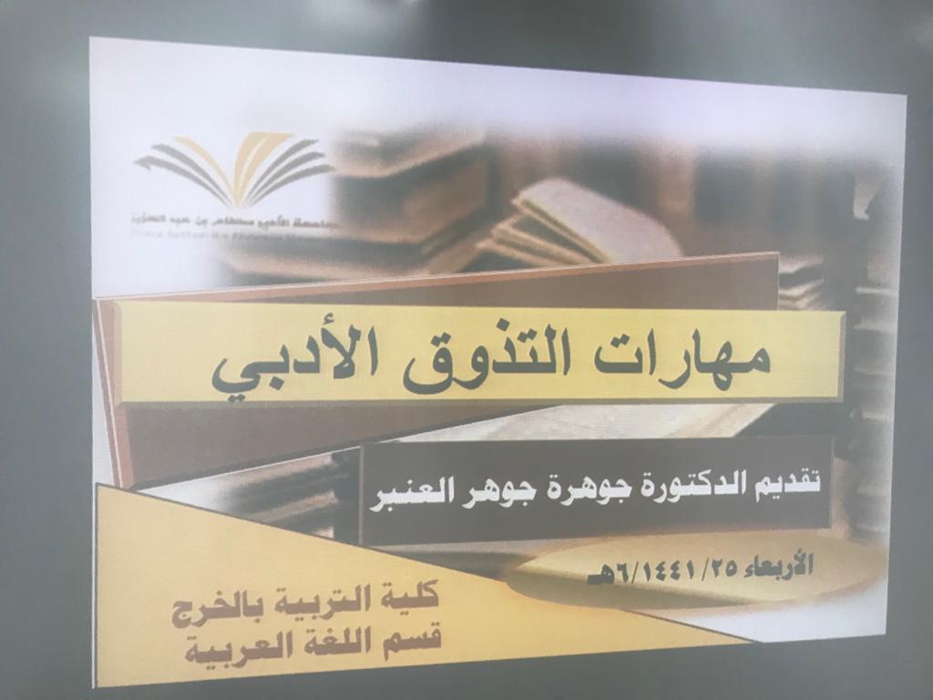 عقد النادي الأدبي المسرحي في كلية التربية بالخرج يوم الأحد الموافق ٢٩-٦-١٤٤١هـ. دورة بعنوان (مهارات التذوق الأدبي) ,ألقتها الدكتورة/الجوهرة العنبر. وتهدف الدورة للتمكن من فهم عناصر العمل الأدبي والخصائص الفنية والجمالية لها ,وإبراز مواطن الجودة والرداءة في العمل الأدبي ,وكذلك تنمية ملكة التذوق الأدبي من خلال التعاطي مع النصوص المختارة من روائع الأدب العربي في عصوره المختلفة وخلق ميول إيجابية لدى المشاركة حيال التذوق الادبي والمتعة الفنية واتساع ثقافة الطالبات التحصيلية في كل أنواع الأدب وموضوعاته .وقد لاقت حضوراً فعالاً من الطالبات.