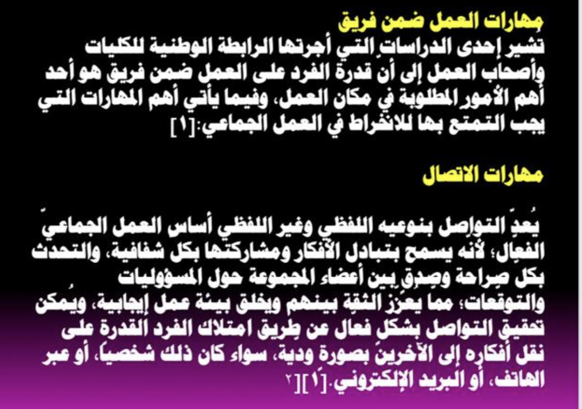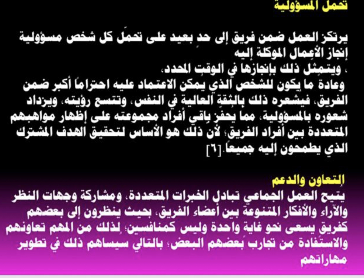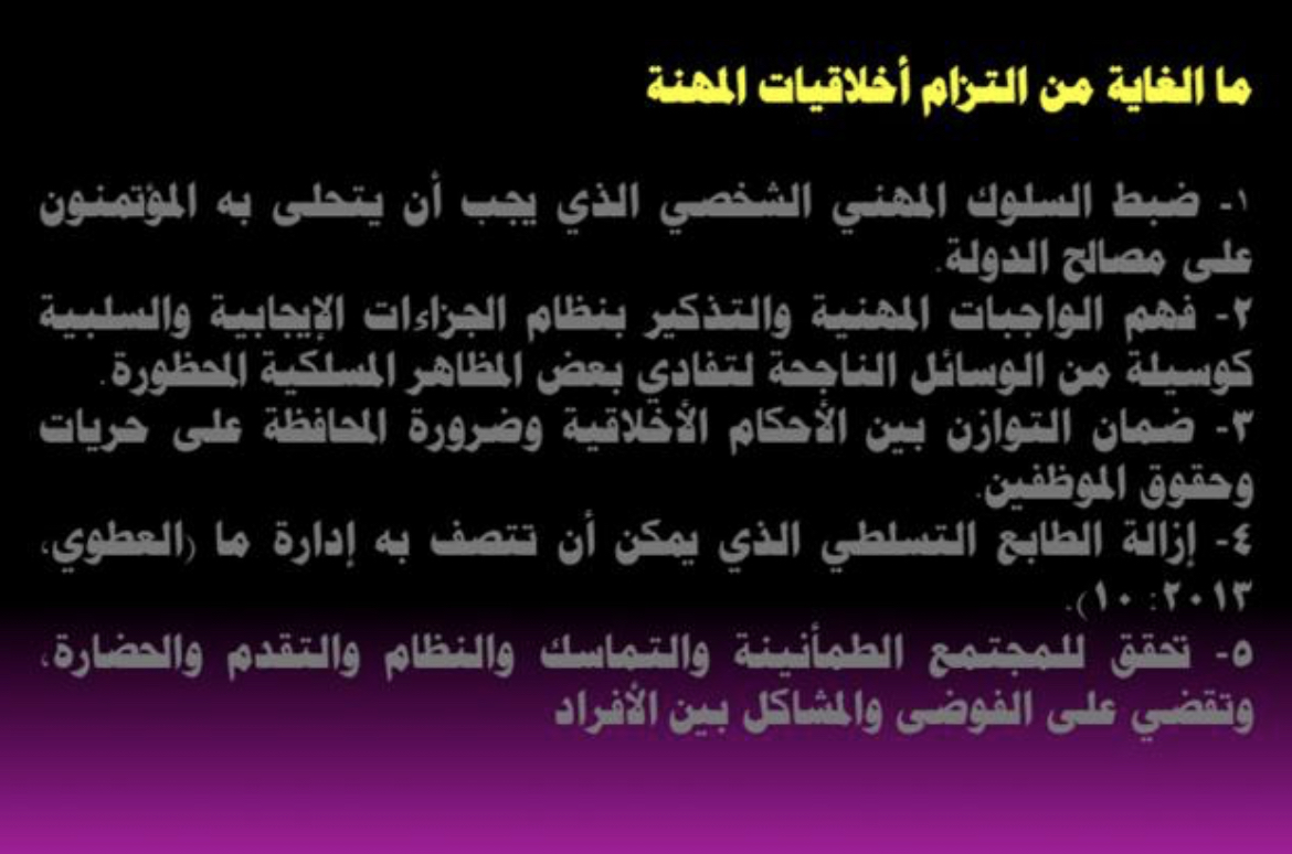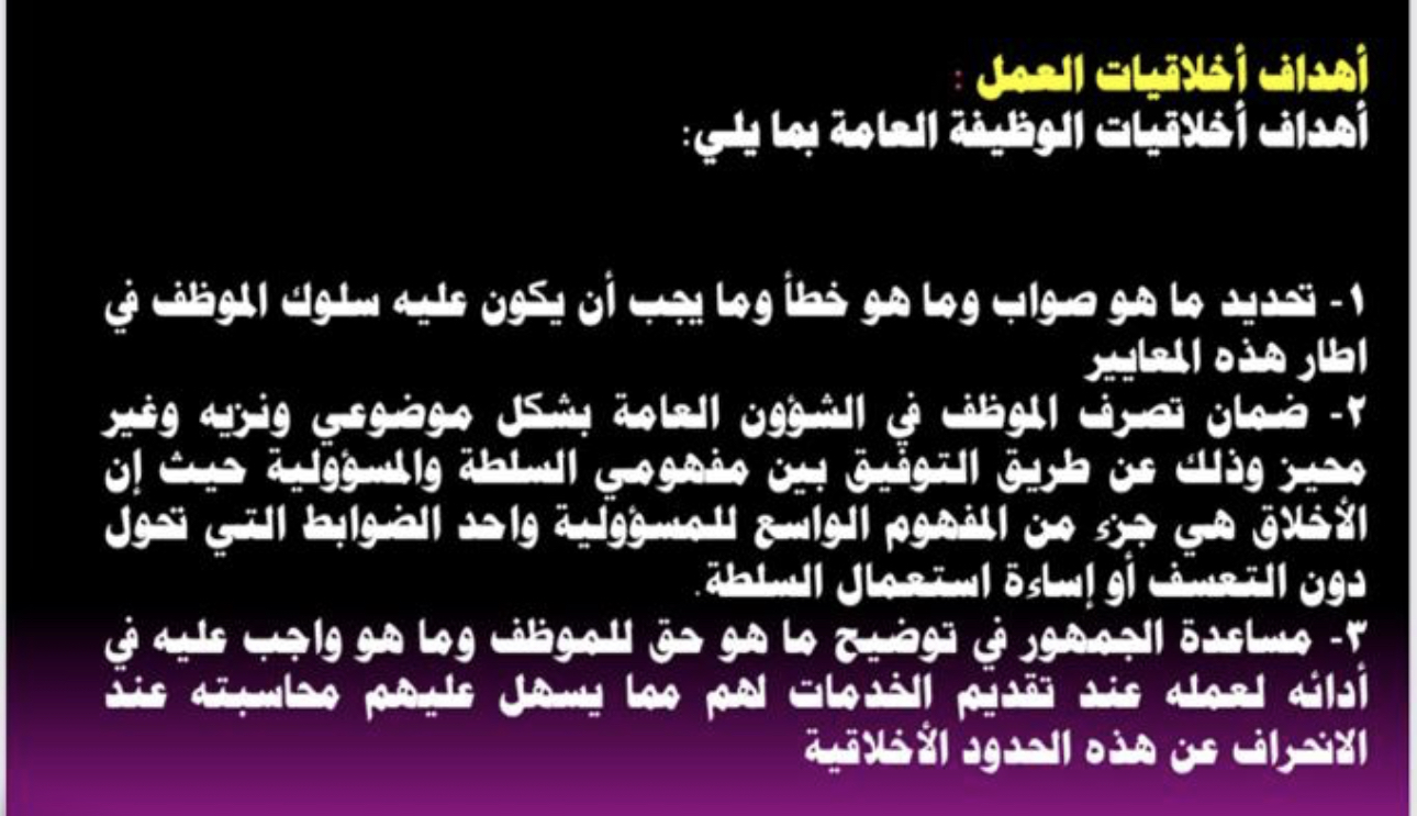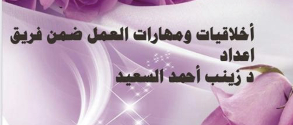 ثم بدأت د. زينب العرض وشرح أخلاقيات العمل وأهمية التحلي بها وأن الإخلال بها يؤدي للفساد الإداري ثم بيان أهمية العمل ضمن فريق و دوره في نجاح العمل وتميز الموظفين ثم بيان العوامل التي تحقق مهارة العمل ضمن فريق.