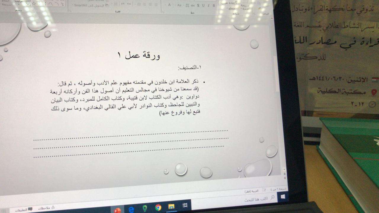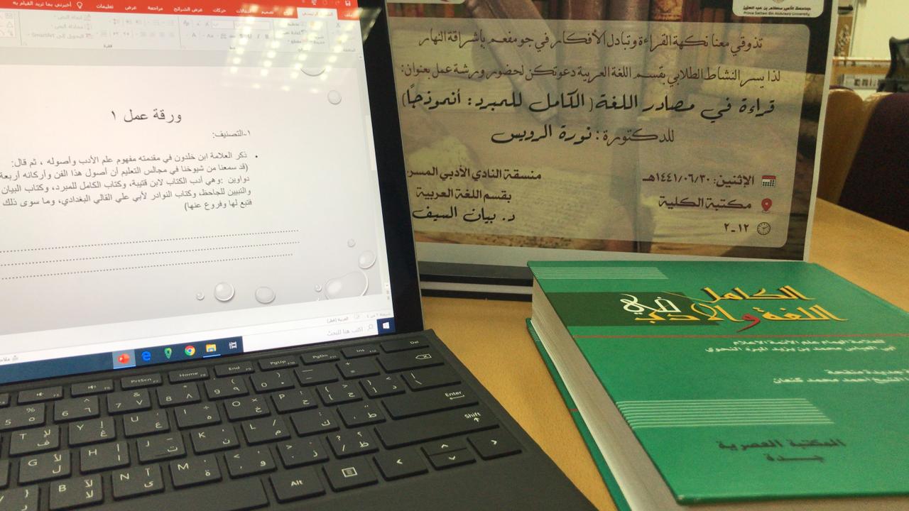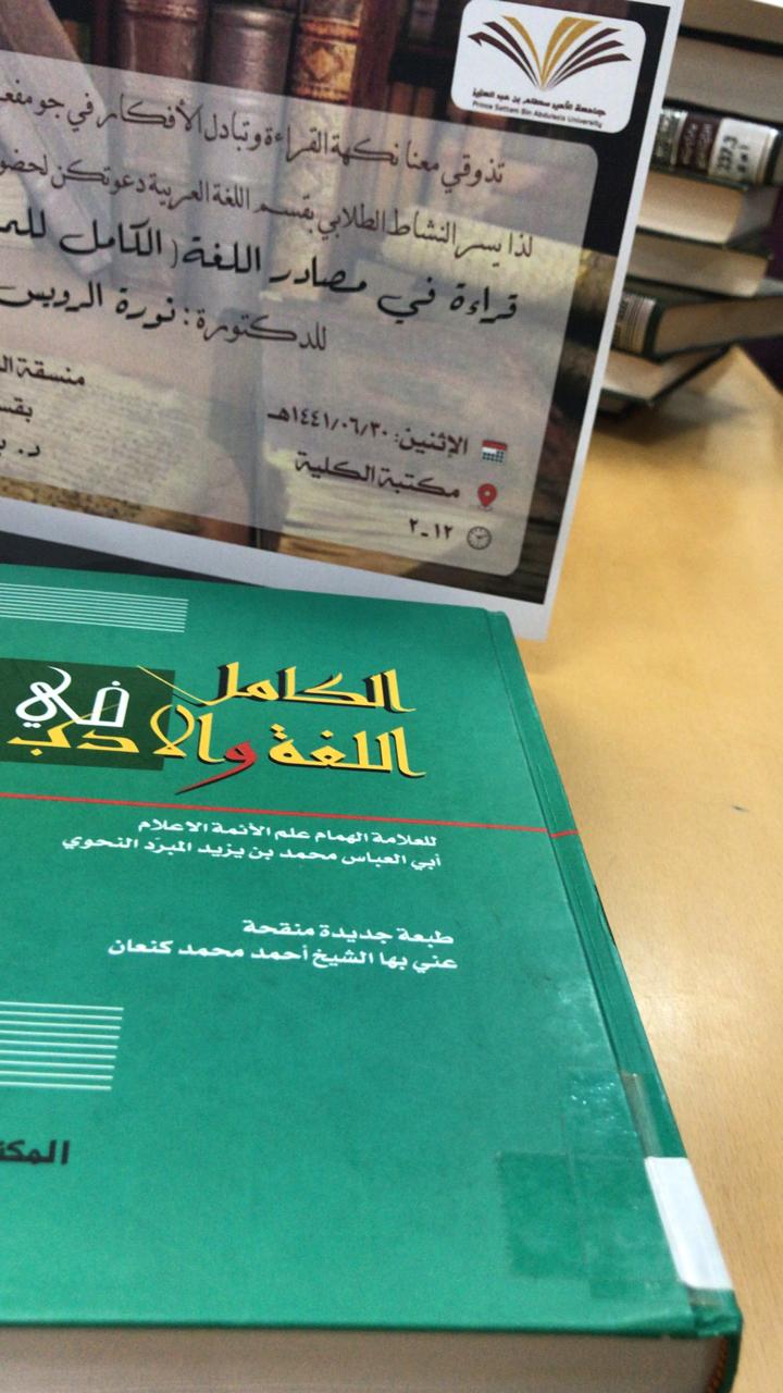 أقام قسم اللغة العربية تحت مظلة وحدة العمل الطلابي دورة بعنوان:( قراءة في مصادر اللغة) للدكتورة/ نورة الرويس,يوم الأثنين الموافق 30 / 6/ 1441هــ. وتهدف الدورة للتعريف بالمبرد ومؤلفاته ومكانتها في المكتبة العربية,و عرض محتويات كتاب (الكامل في اللغة والأدب) ,وتصنيف الكتاب ومكانته في المكتبة العربية, و تطبيق مهارة القراءة السريعة للتعرف على منهج الكتاب,وتطبيق القراءة التحليلية النقدية لنصوص من الكتاب.