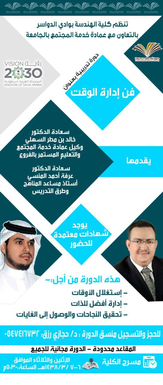 تنظم كلية الهندسة بوادي الدواسر و بالتعاون مع عمادة خدمة المجتمع و التعليم المستمر ، البرنامج التدريبي المميز " فــن إدارة الـوقـت "