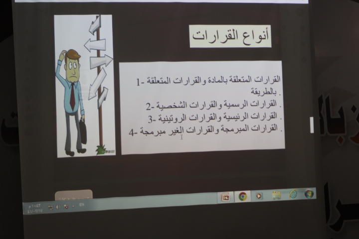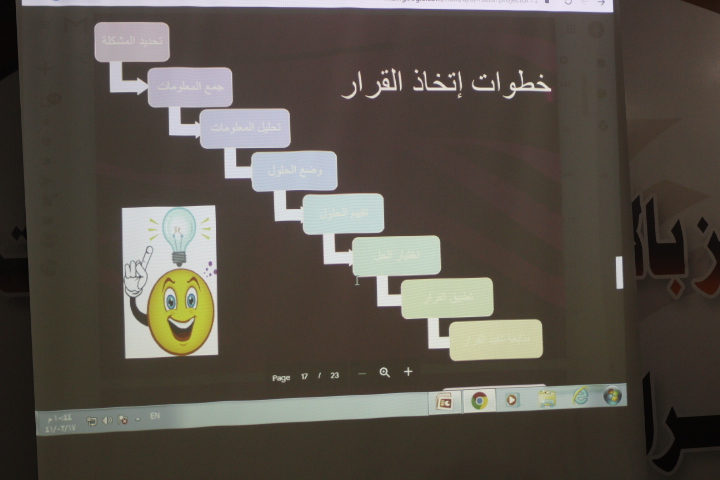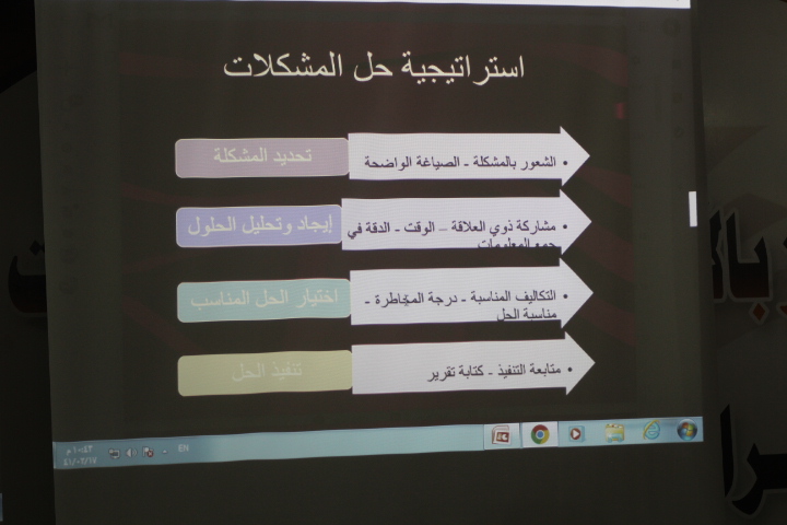قامت وحدة الخريجات بكليات الأفلاج (قسم الطالبات) يوم الأربعاء 1441/2/17هـ الساعة العاشرة صباحاً في المسرح بتنظيم دورة بعنوان (فن حل المشكلات) قدمتها د. نهاد عبدالمطلب، تحدثت فيها عن تعريف المشكلة وكيفية صياغتها، و المهارات الإبداعية لحل المشكلات، وخطوات حل المشكلة ومنها تحليل المشكلة وجمع معلومات حول المشكلة و دراسة الحلول المقترحة دراسة وافية، كما ذكرت أنواع القرارات وخطوات اتخاذ القرار، واختتمت الدورة بالإجابة عن استفسارات الطالبات.
