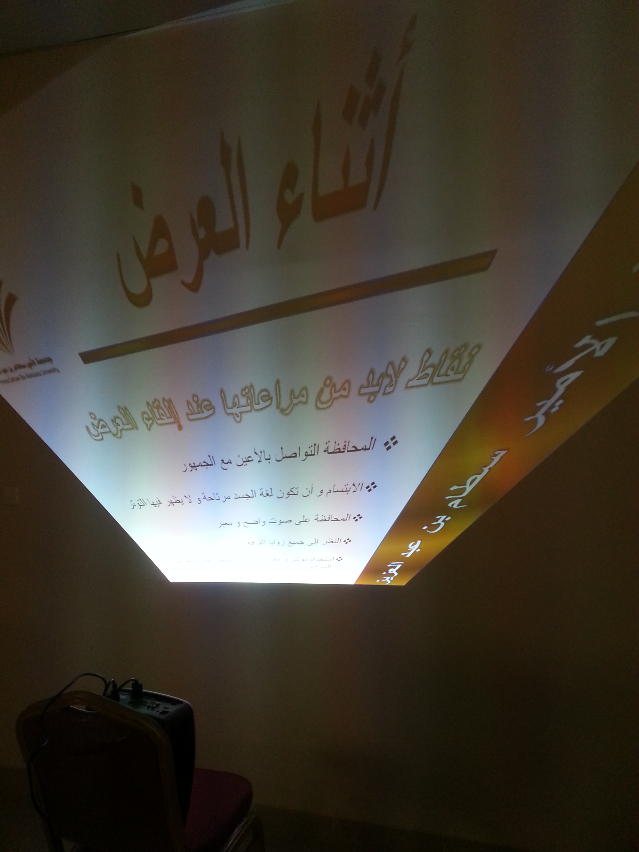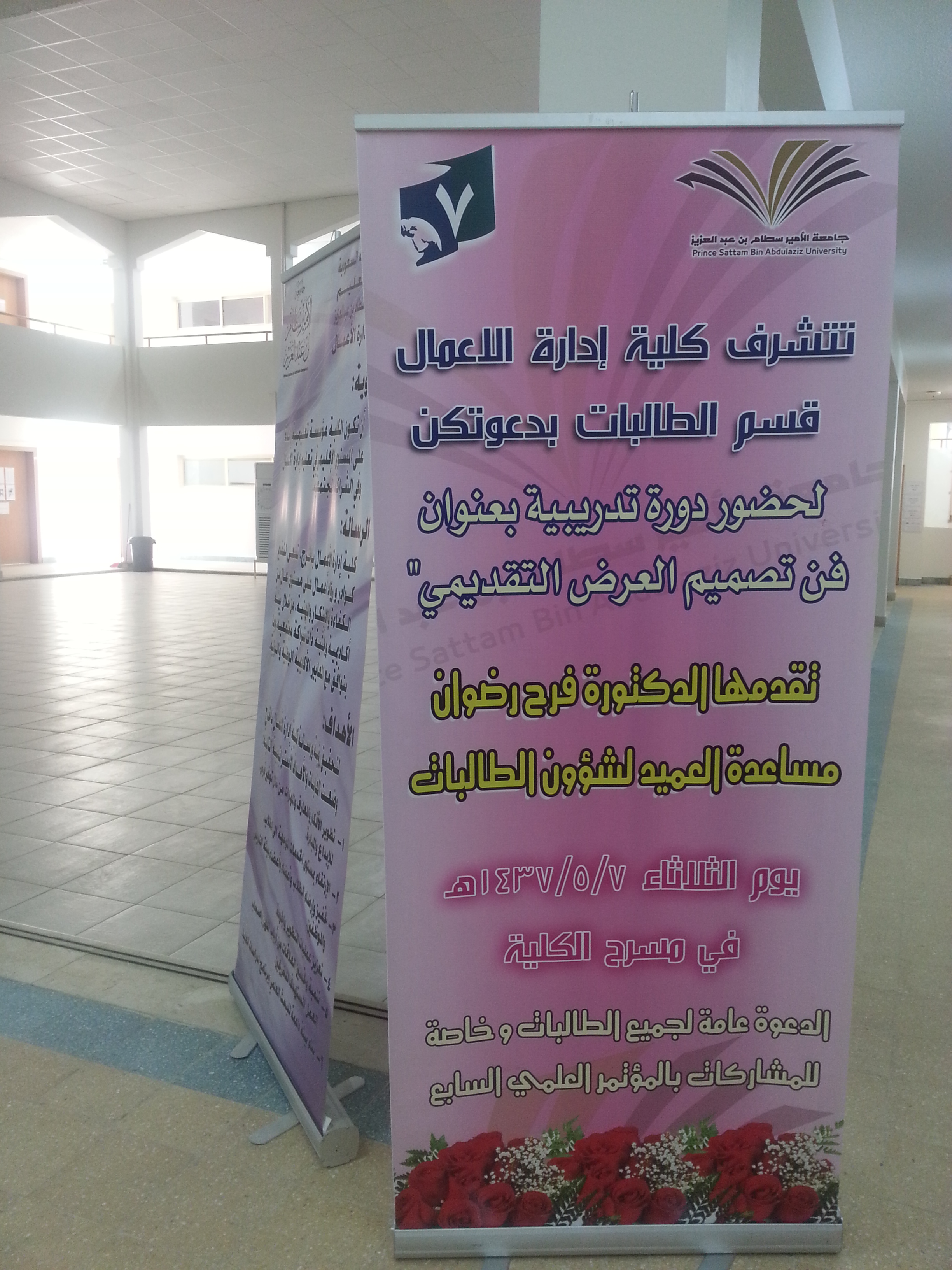 نظمت وحدة النشاط الطلابي بكلية إدارة الأعمال- قسم الطالبات دورة تدريبية بعنوان "فن تصميم العروض التقديمية"قدمتها الدكتورة فرح رضوان يوم الثلاثاء الموافق1437/5/7هـ تضمنت الدورة توضيح لأهمية تصميم عرض تقديمي بشكل جذاب ومرتب كما أشارت إلى نقاط الضعف والقوة في العروض التقديمية كما تم عرض بعض الأخطاء الشائعة .هذا وقد حضر الدورة عدد كبير من الطالبات والهيئة الادارية كما نالت الدورة استحسان الحضور.