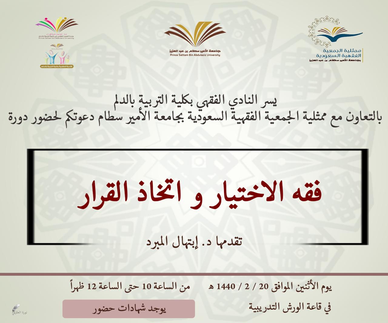 يسر النادي الفقهي بالتعاون مع ممثلية الجمعية الفقهية السعودية بالجامعة دعوتكم لحضور دورة بعنوان ((فقه الاختيار واتخاذ القرار)) تقدمها سعادة الدكتورة/ ابتهال المبرد - بكلية التربية بالدلم ، والتي ستعقد من الساعة 10:00ص وحتى الساعة 12:00 بقاعة الورش التدريبية يوم الاثنين 20-2-1440هـ ، علماً بأنه يوجد شهادات للحضور