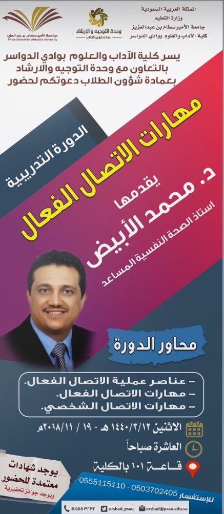 تنظم كلية الآداب والعلوم بوادي الدواسر يوم غداً الأثنين الموافق 1440/3/13هـ الساعة العاشرة صباحاً ، دورة تدريبية في ” مهارات الاتصال الفعال” وذلك بالتعاون مع وحدة التوجيه والإرشاد بعمادة شؤون الطلاب بقاعة ( 101 ) بالكلية .