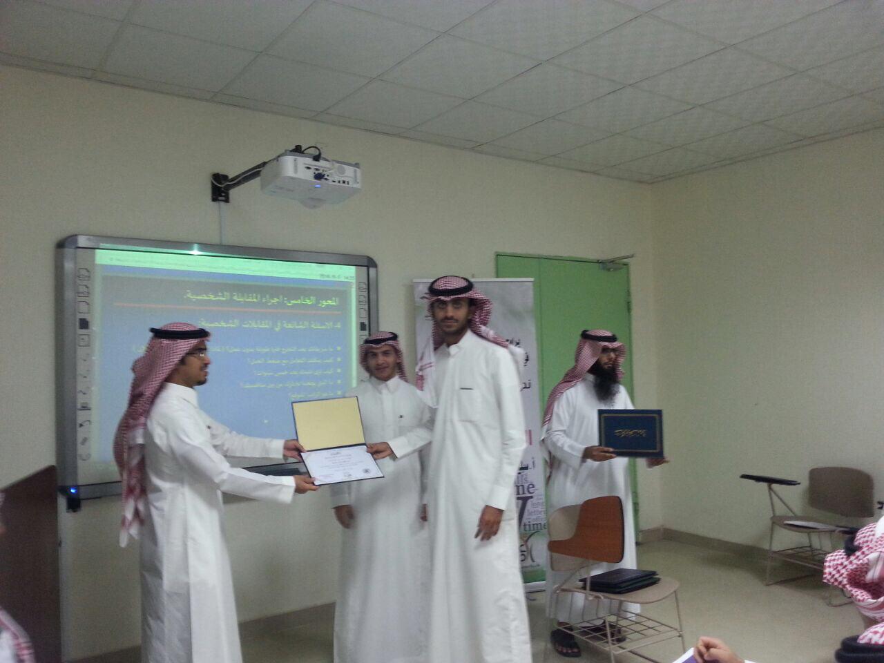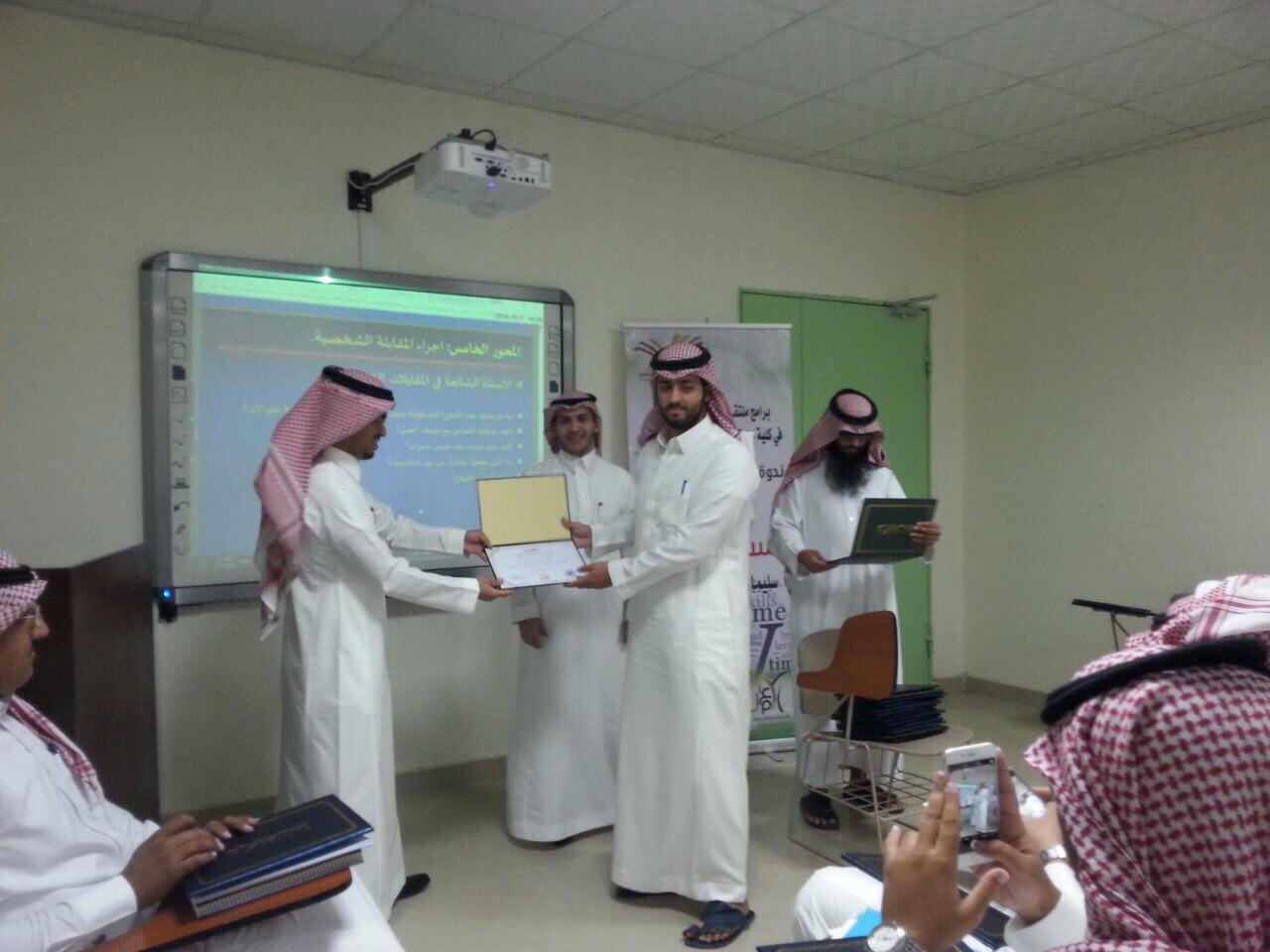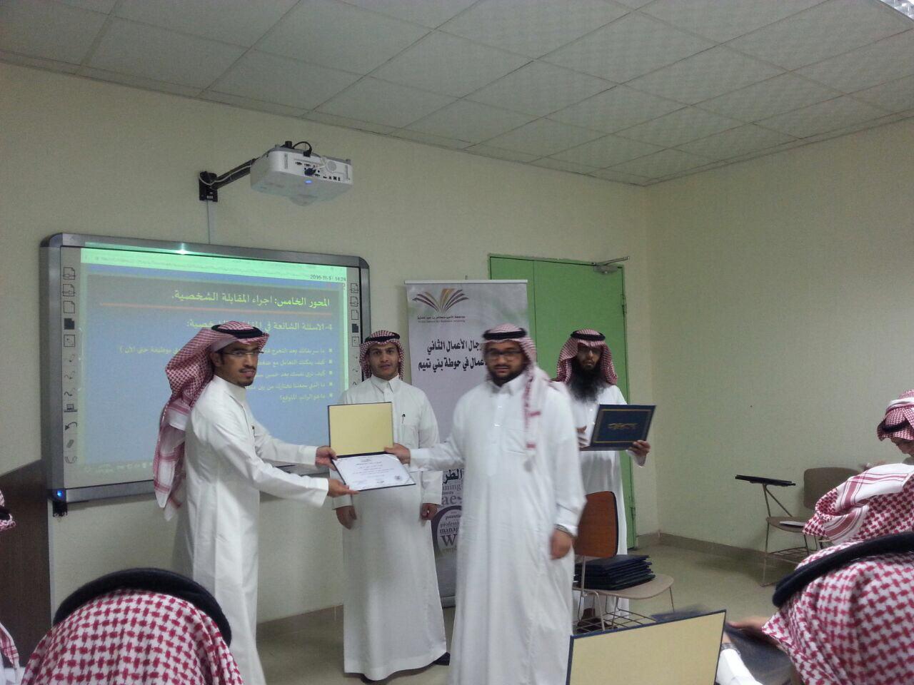وفي نهاية الدورة التدريبية قدم مدير التوظيف للفروع في مصرف الراجحي الأستاذ سليمان بن محمد الطرباق شهادات حضور الدورة للطلاب.