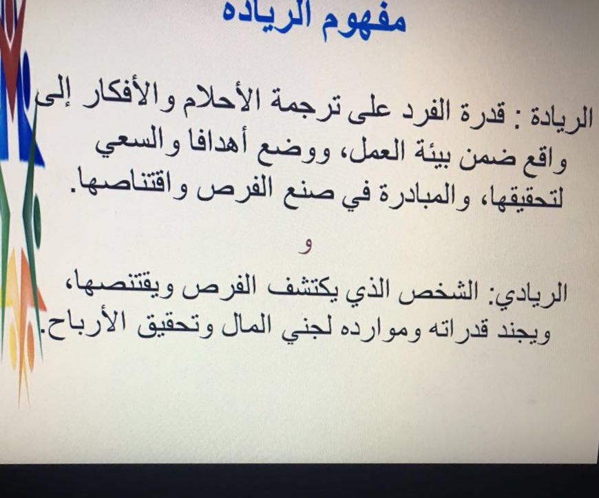 عقدت وحدة الخريجات في الكلية تحت إشراف الاستاذة بتول العنزي اليوم الأحد الموافق ١٩/٧/١٤٣٨ دورة بعنوان" كيف تأسس مشروعاً ناجحاً" للدكتورة أميرة الحموري وقد كان من أهم أهداف الدورة التعرف على مفهوم الريادة والتعرف على سمات الريادي الناجح وتصنيف المشاريع وقد حازت على إستحسان جميع الحضور من خريجات وطالبات نفع الله بها .