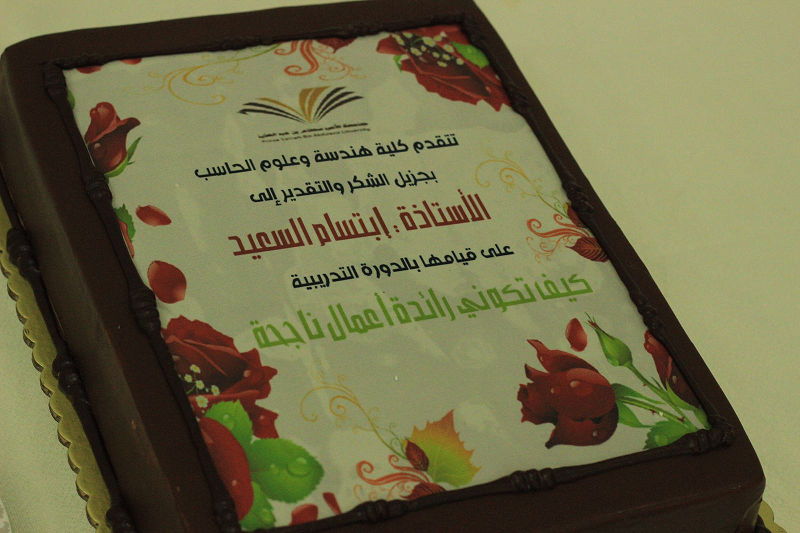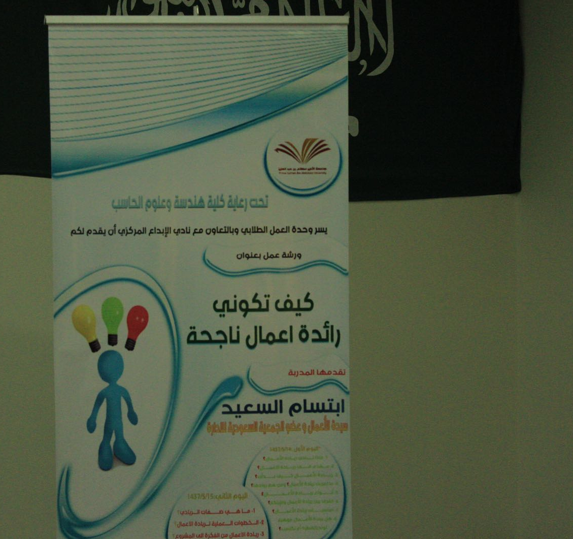 ضمن فعاليات التحضير للمؤتمر العلمي السابع بكلية هندسة و علوم الحاسب بالخرج ( شطر الطالبات ) تم بحمد الله اكتمال تدريب ما يقارب 140 طالبة في مجال ريادة الأعمال على يد سيدة الأعمال الأستاذة / ابتسام بنت فهد السعيد عضو الجمعية السعودية للإدارة وذلك من خلال تقديم دورة تدريبية مكثفة استمرت لمدة ثلاث أيام في الفترة من 14 – 16 / 05 /1437 هـ