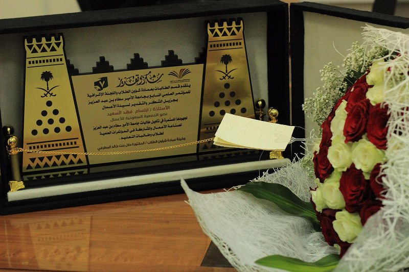 كما شاركت عمادة شؤون الطلاب و اللجنة الإشرافية للمؤتمر العلمي السابع متمثلة بالدكتورة إيمان أبو سليم بتقديم شكرهم للأستاذة ابتسام على جهودها المستمرة تجاه طالبات جامعة الأمير سطام بن عبدالعزيز , داعين المولى عزوجل أن يوفقها و يسدد خطاها .